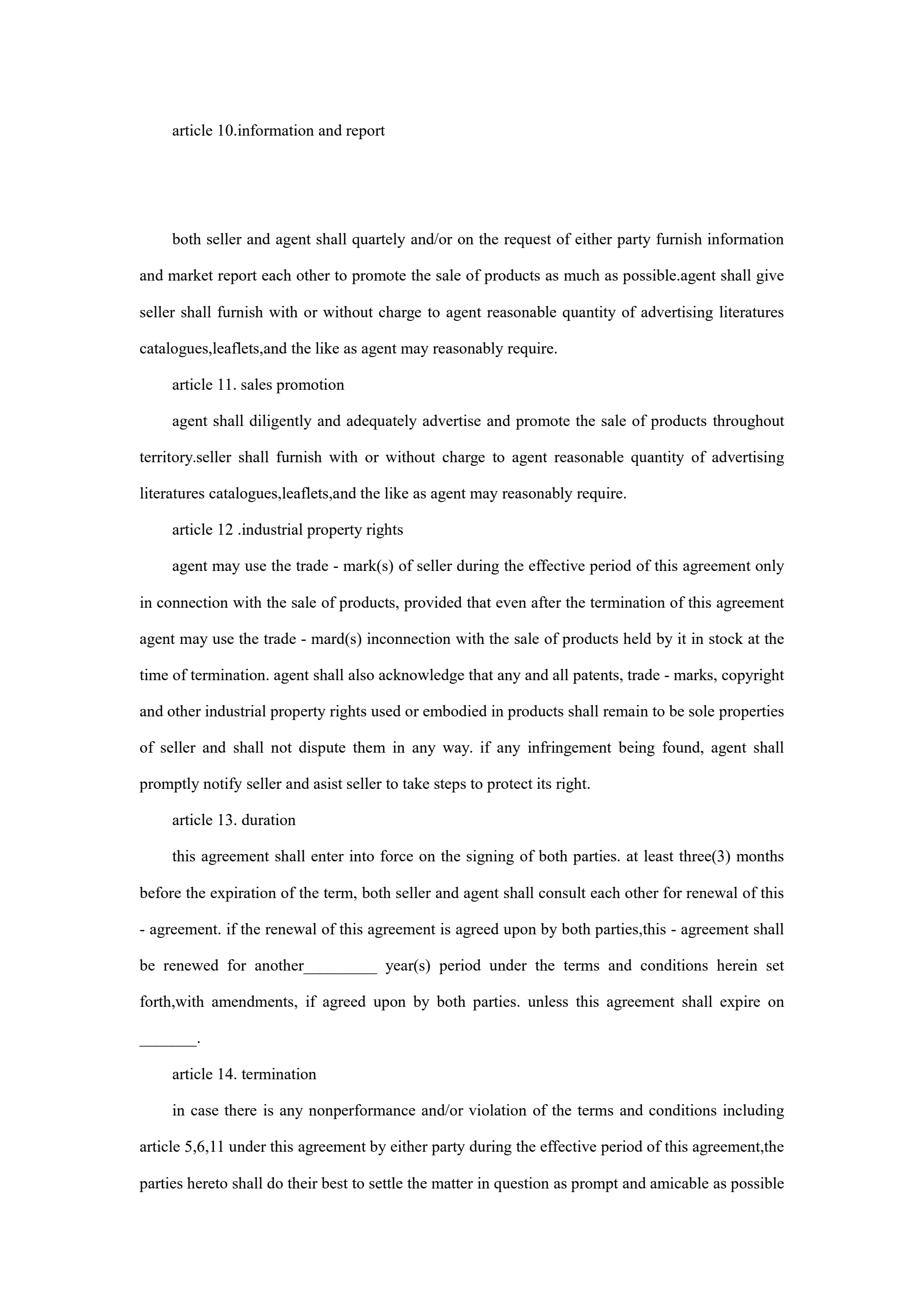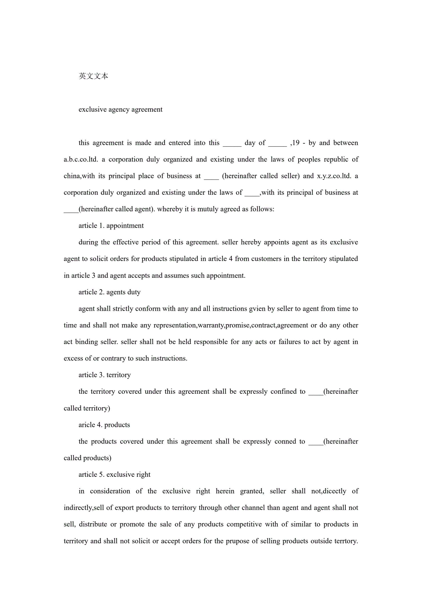 独家代理合同协议