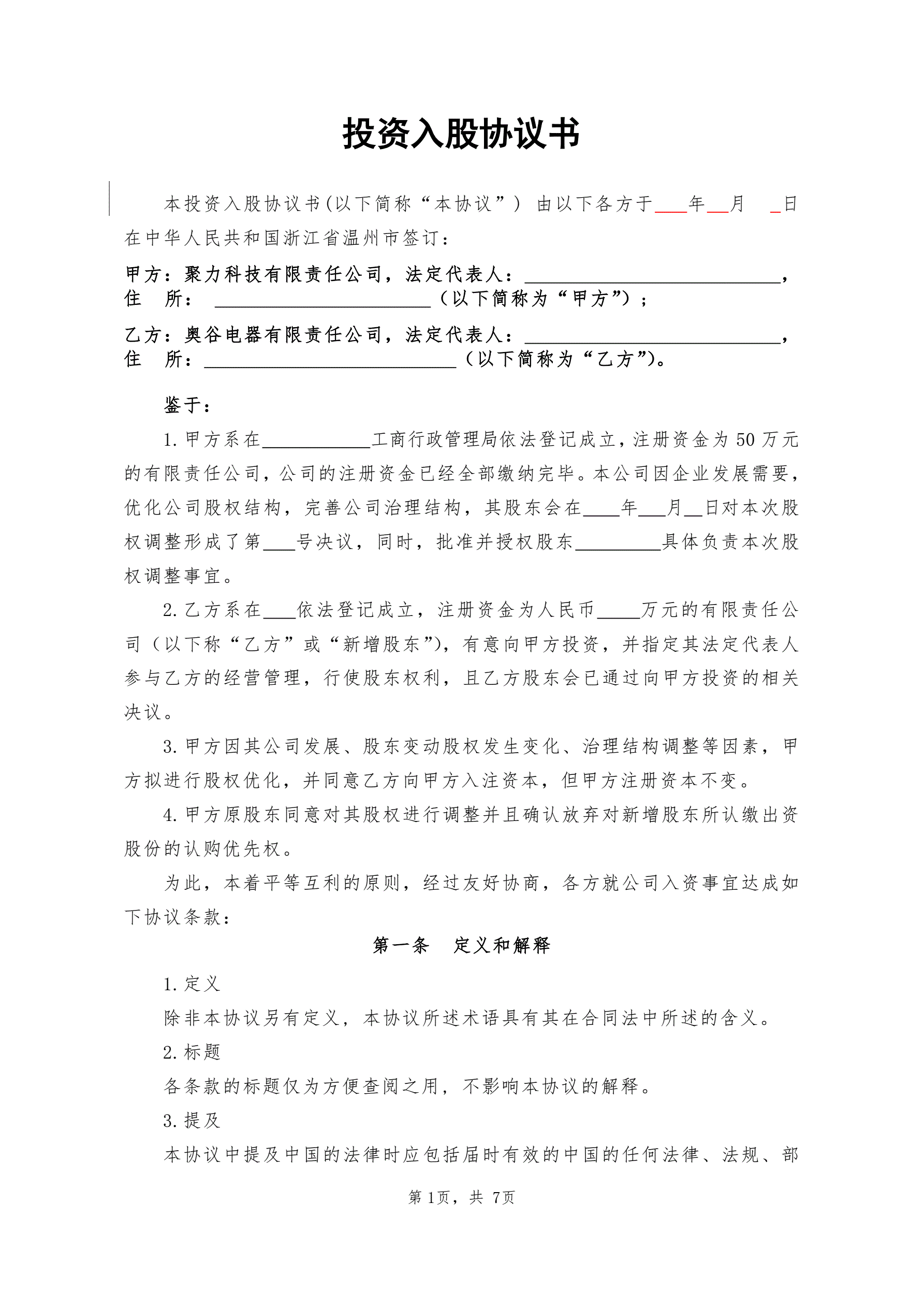 投资入股协议书