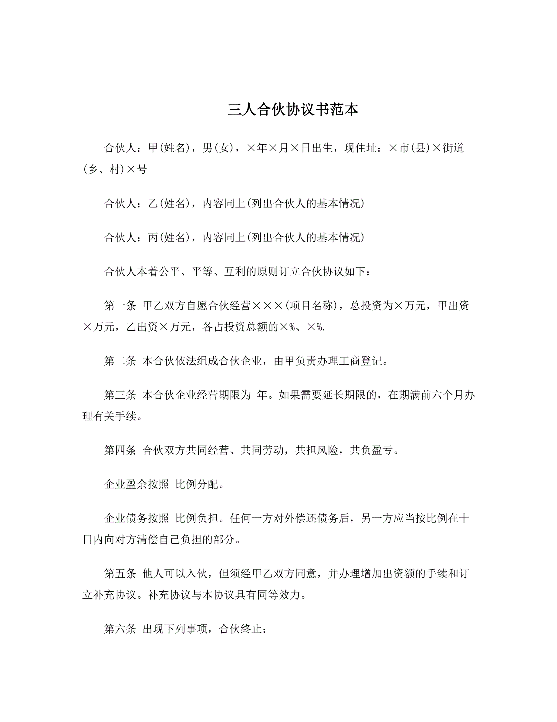 三人合伙协议书范本