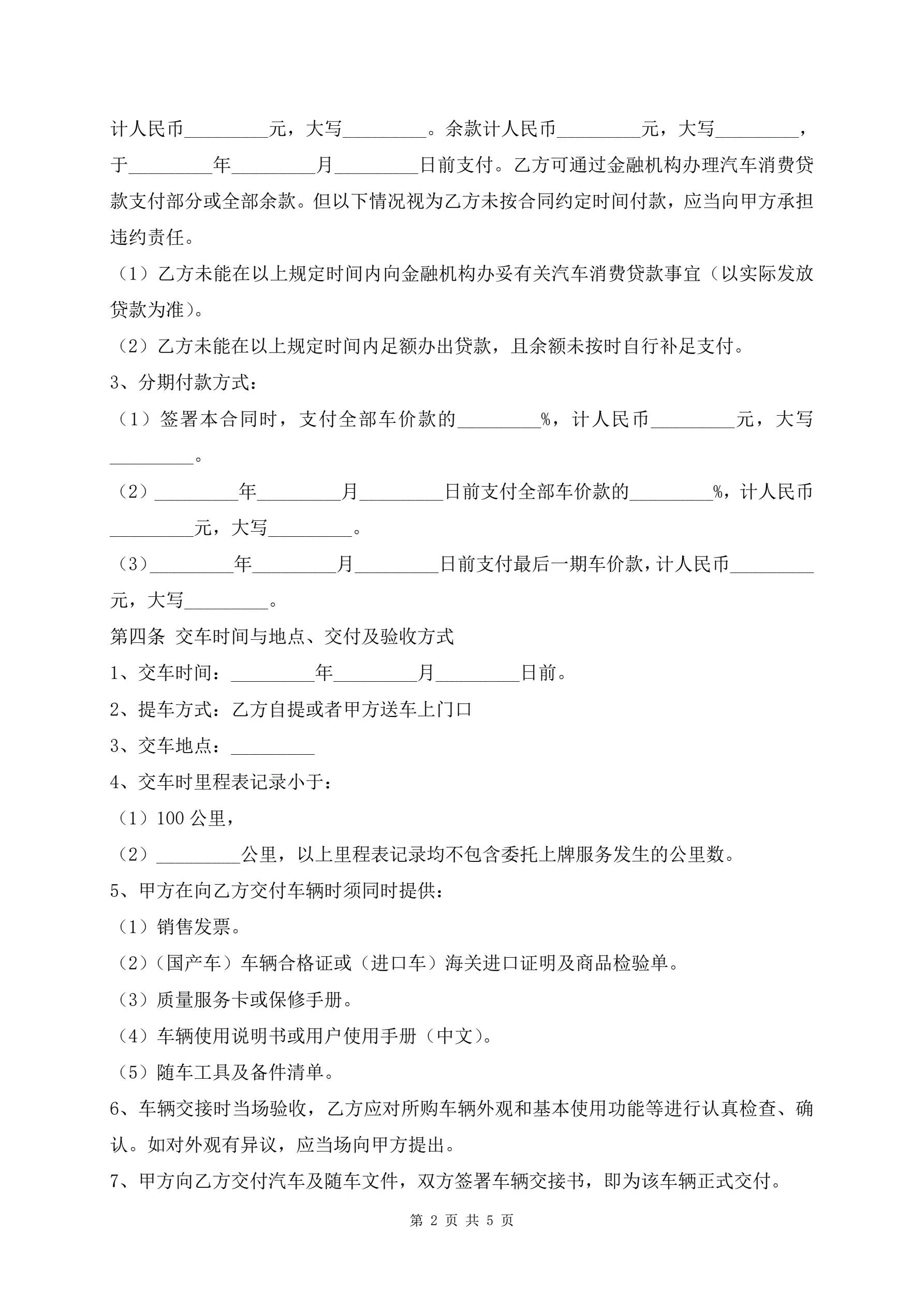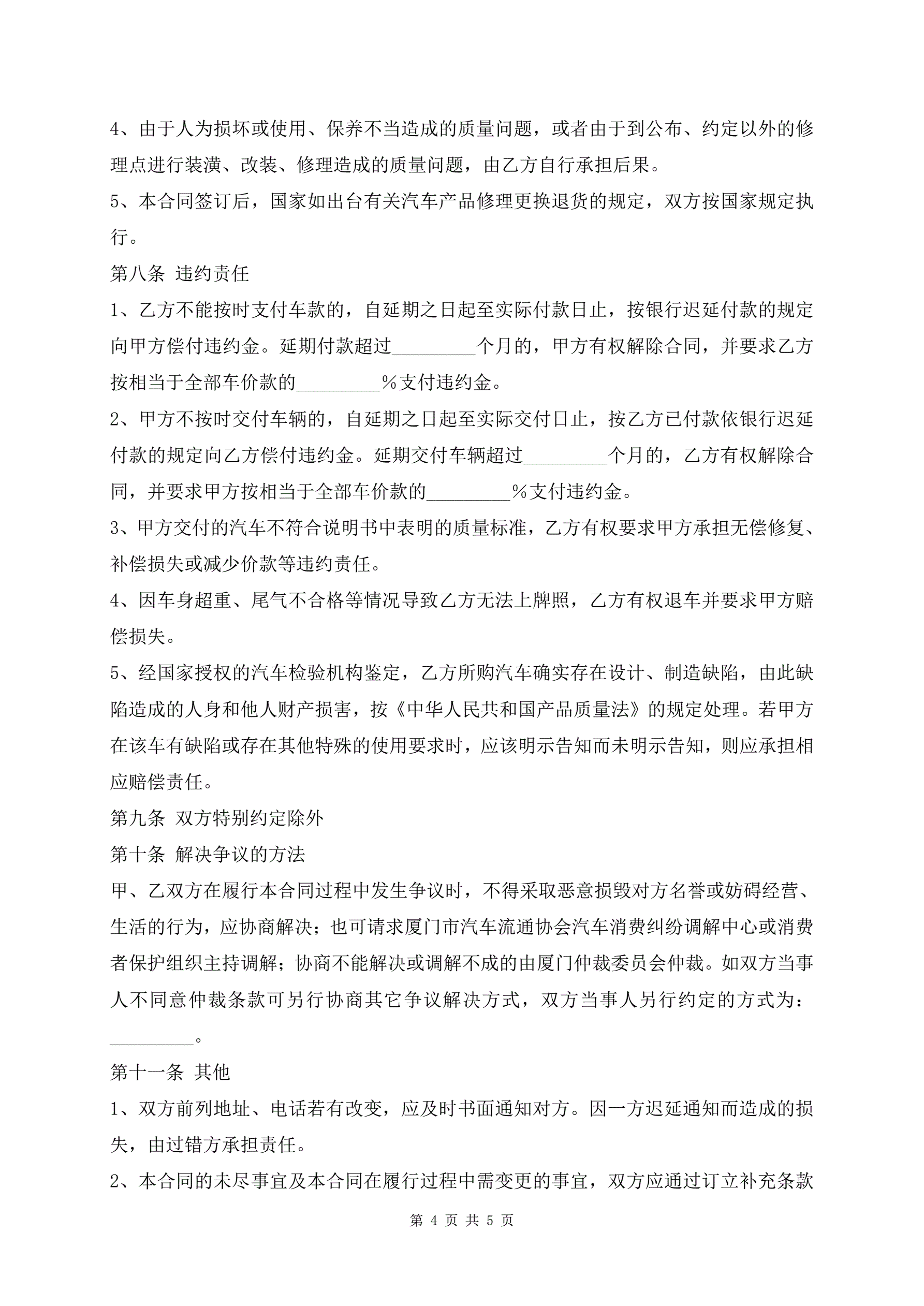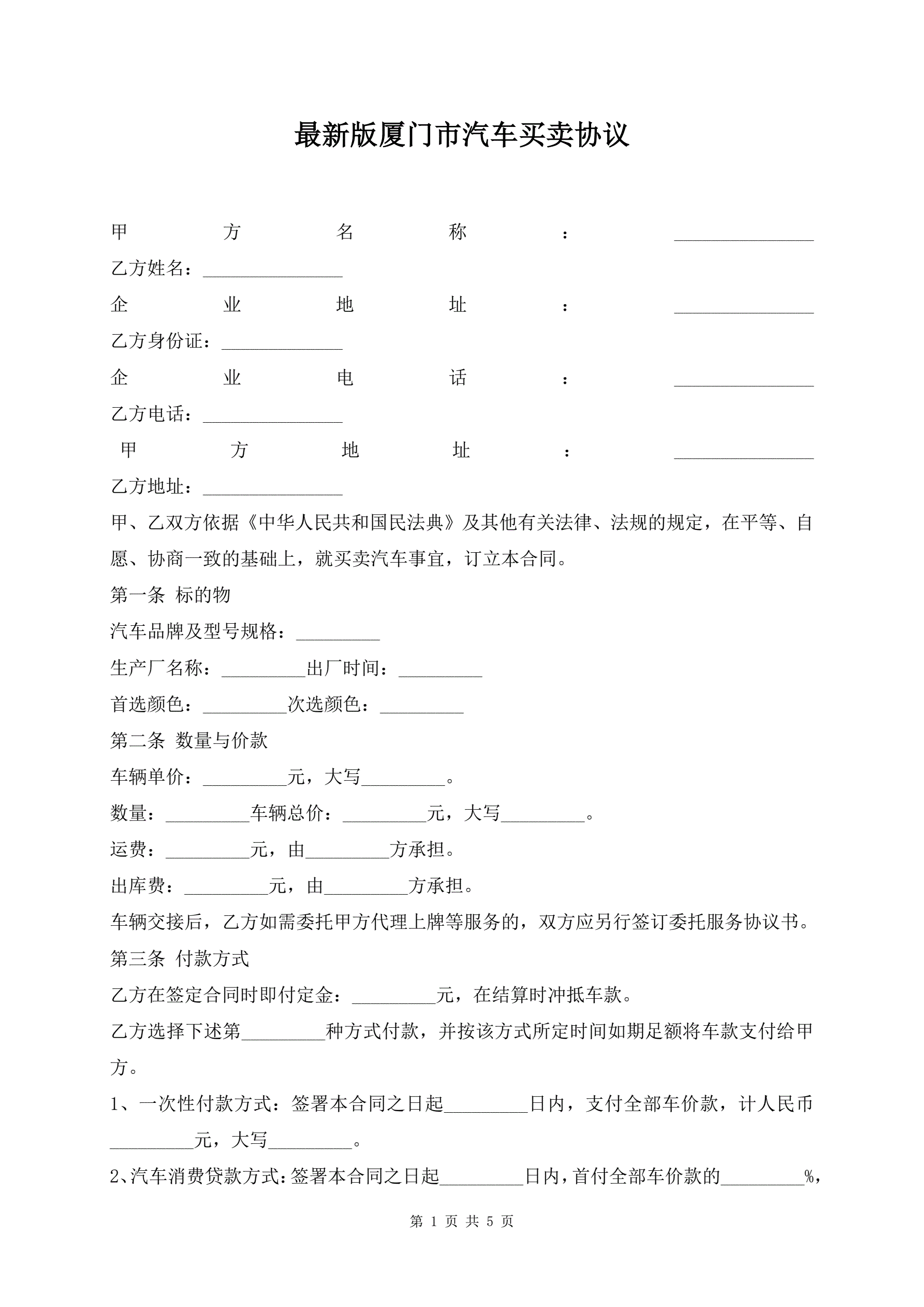 最新版厦门市汽车买卖协议