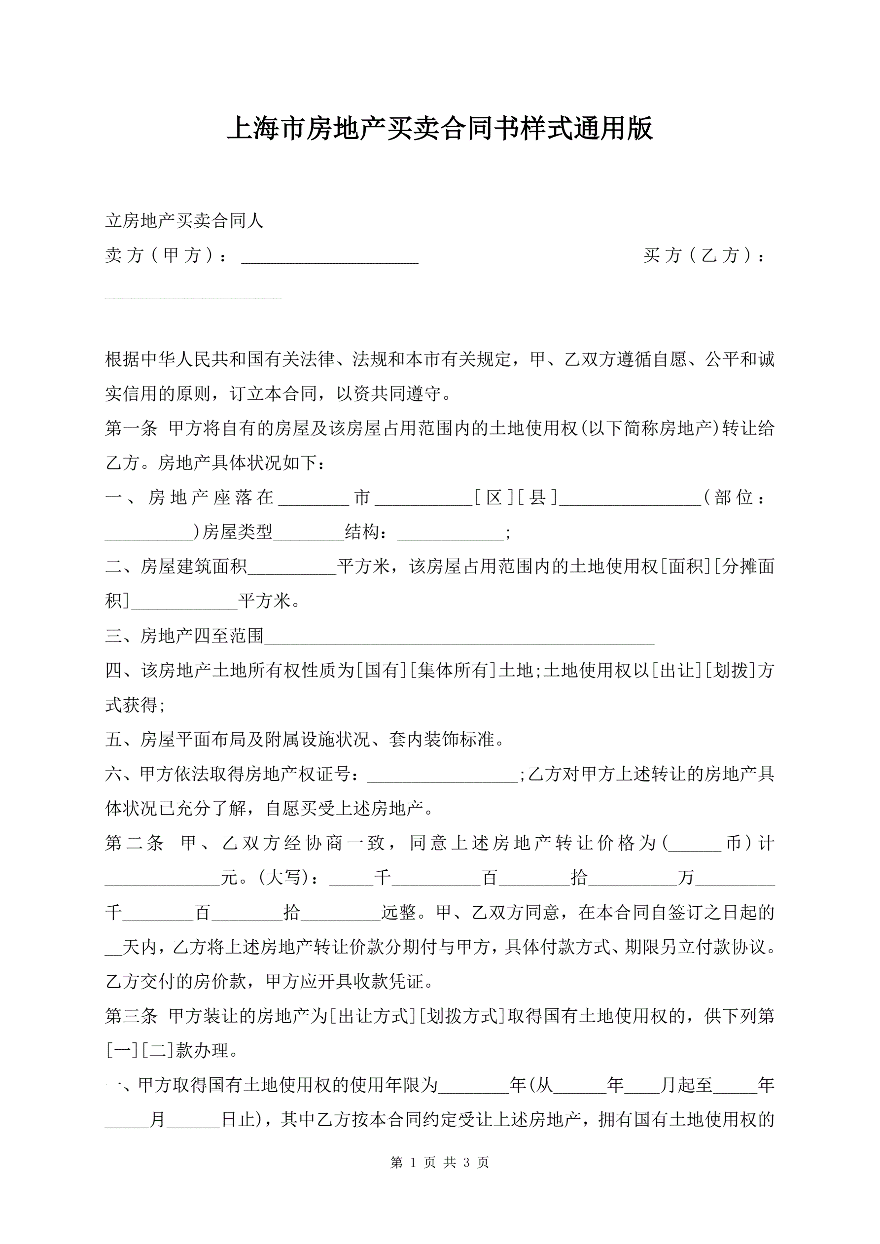 上海市房地产买卖合同书样式通用版