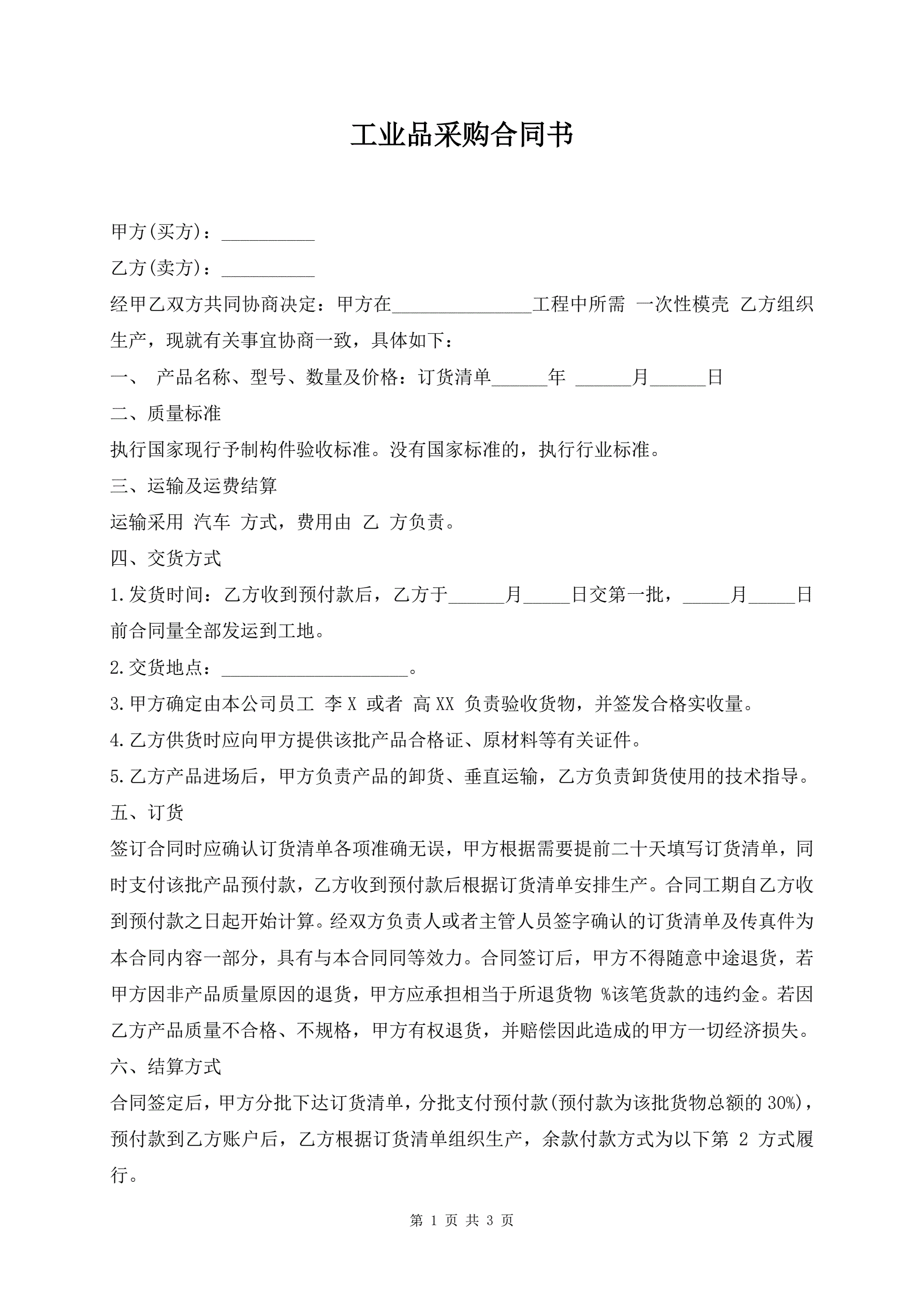 >工业品采购合同书