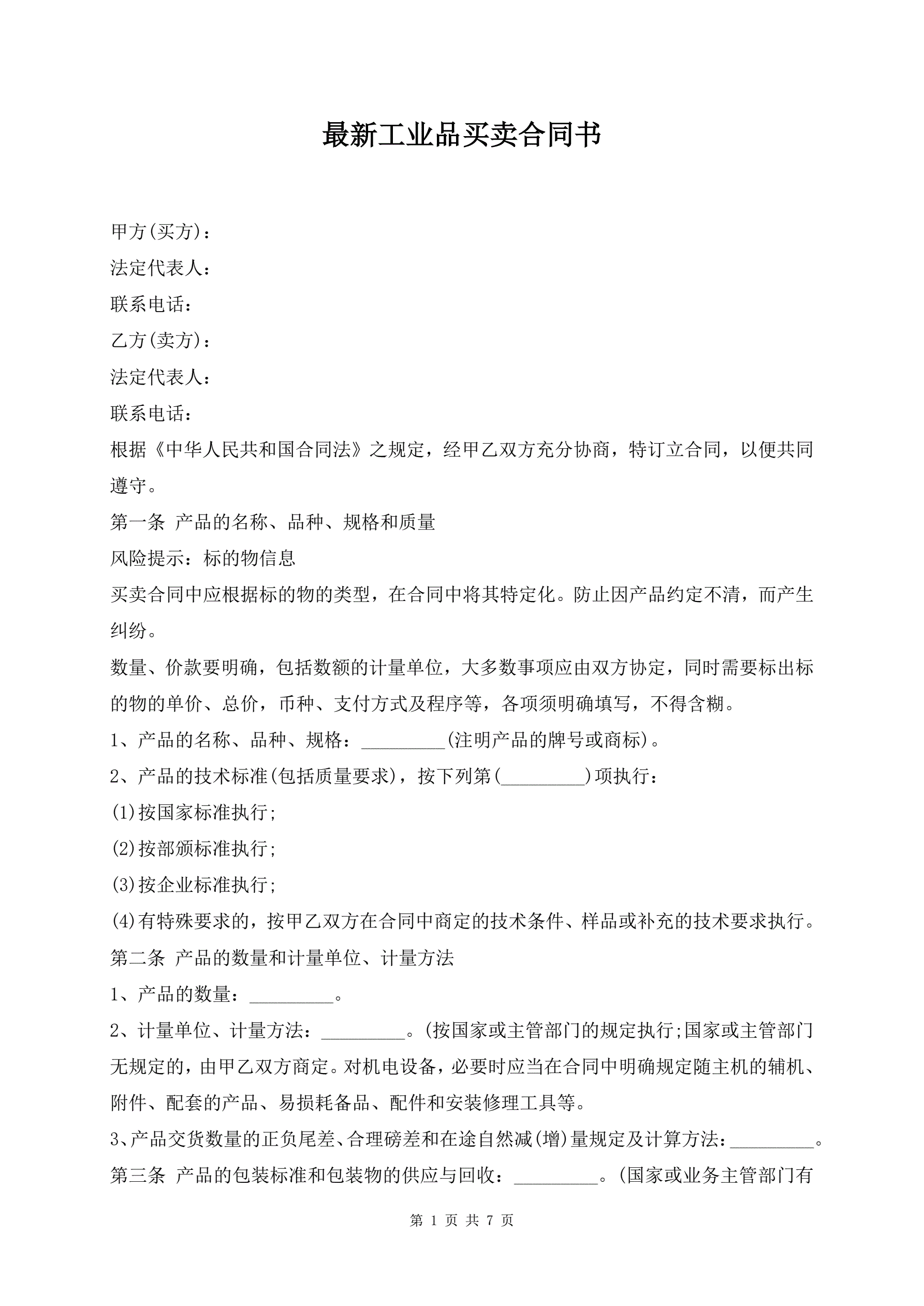 >最新工业品买卖合同书