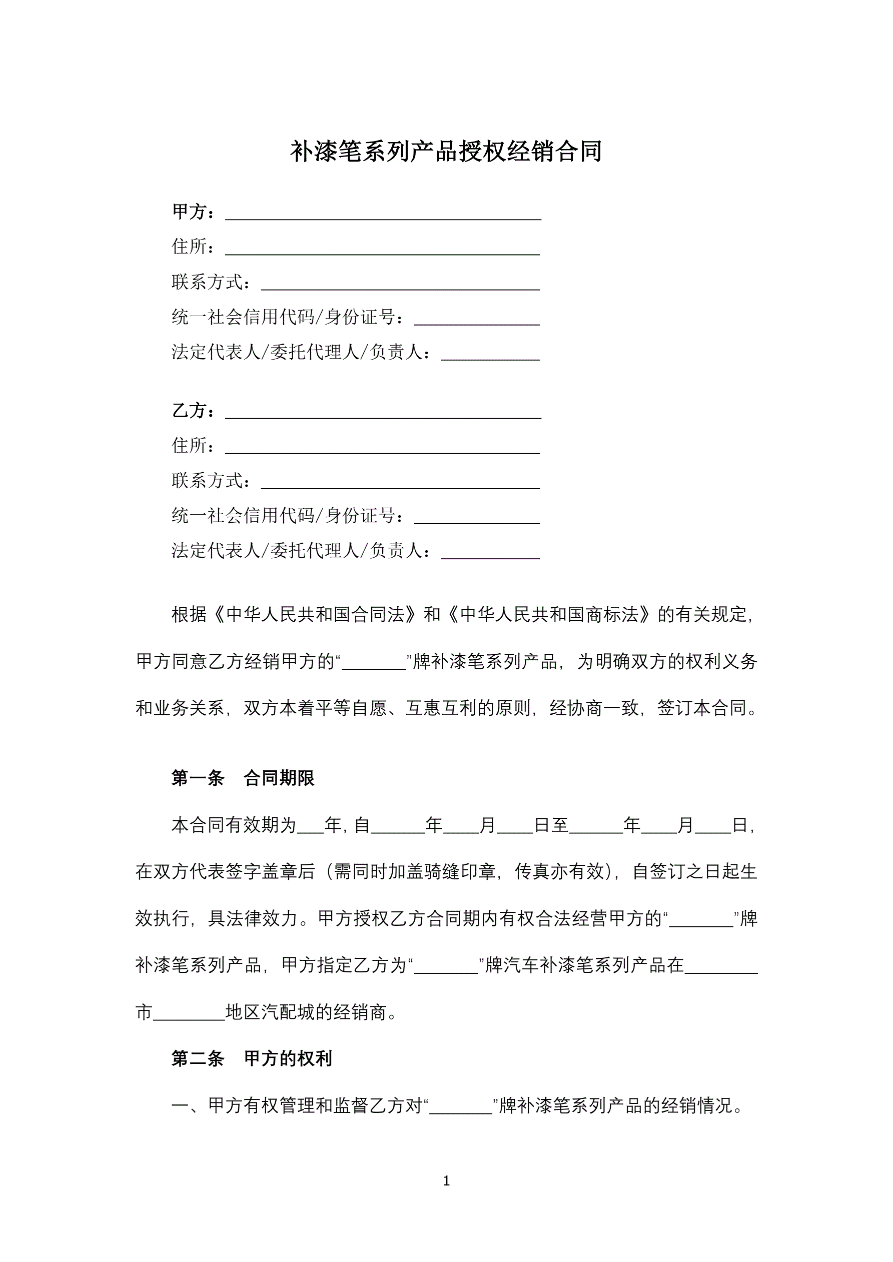 >补漆笔系列产品授权经销合同