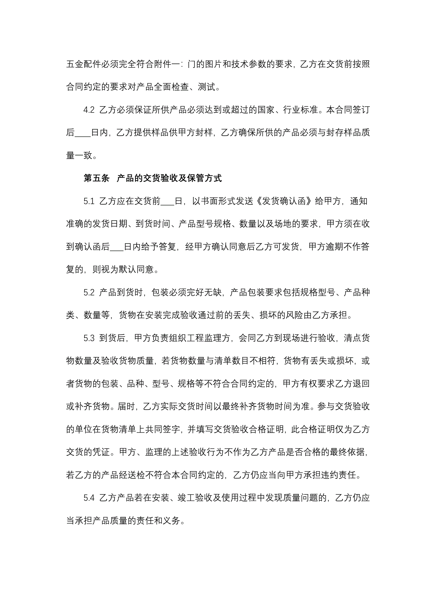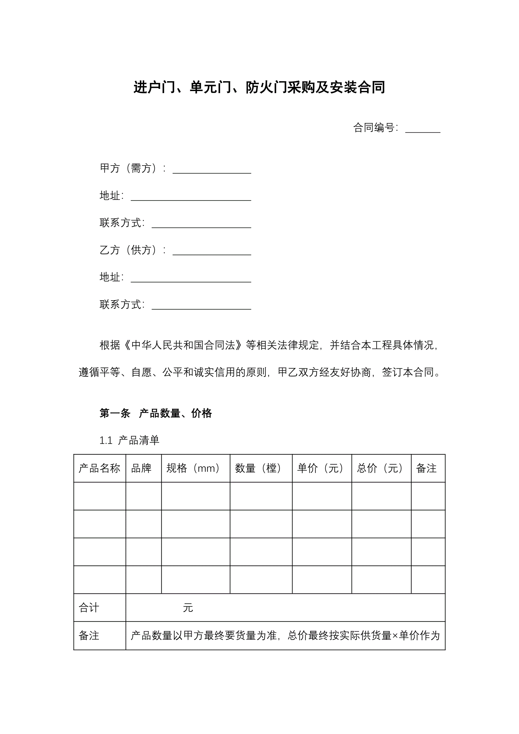 合同名称:单元门、防火门采购及安装合同