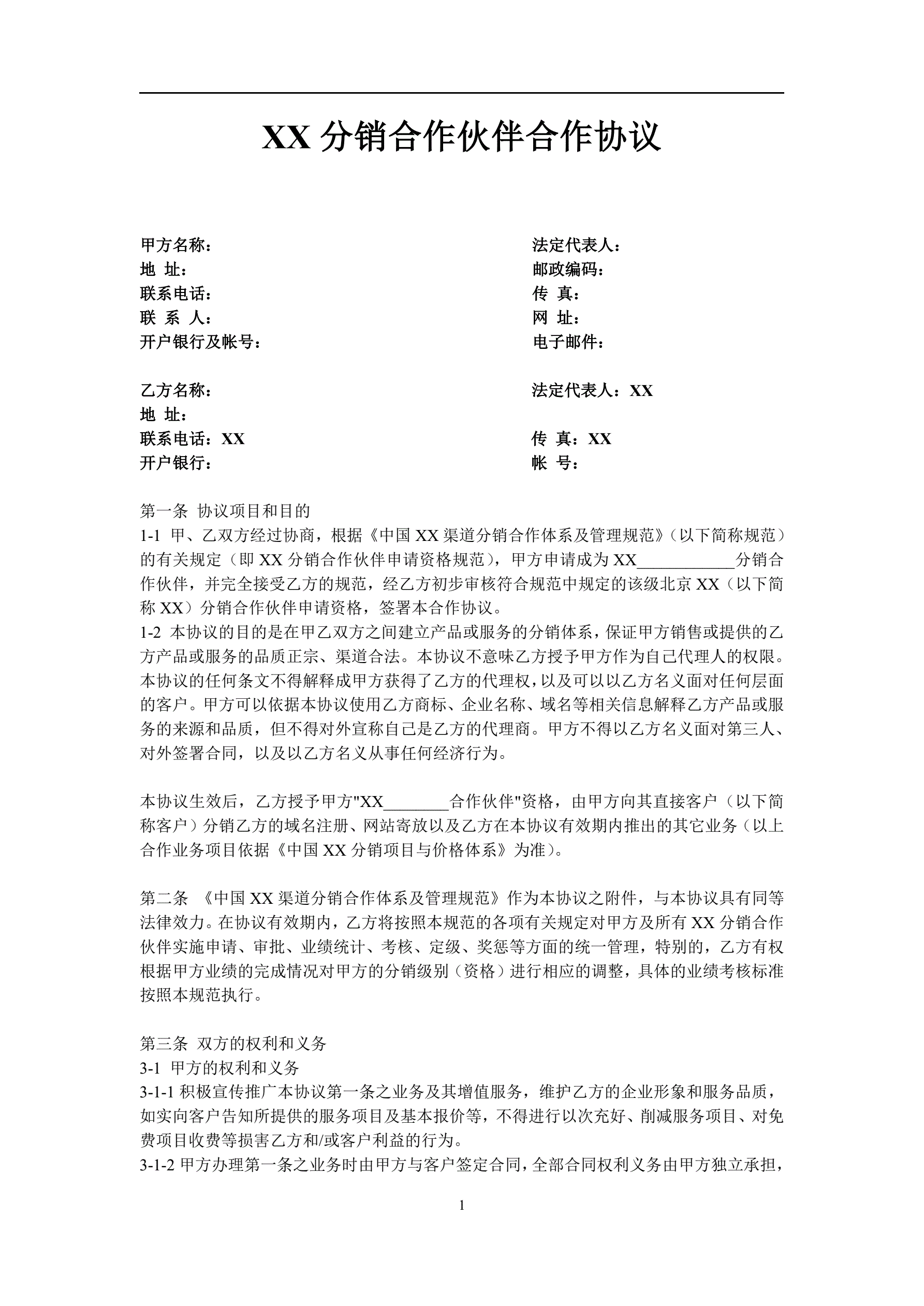 >XX分销合作伙伴合作协议