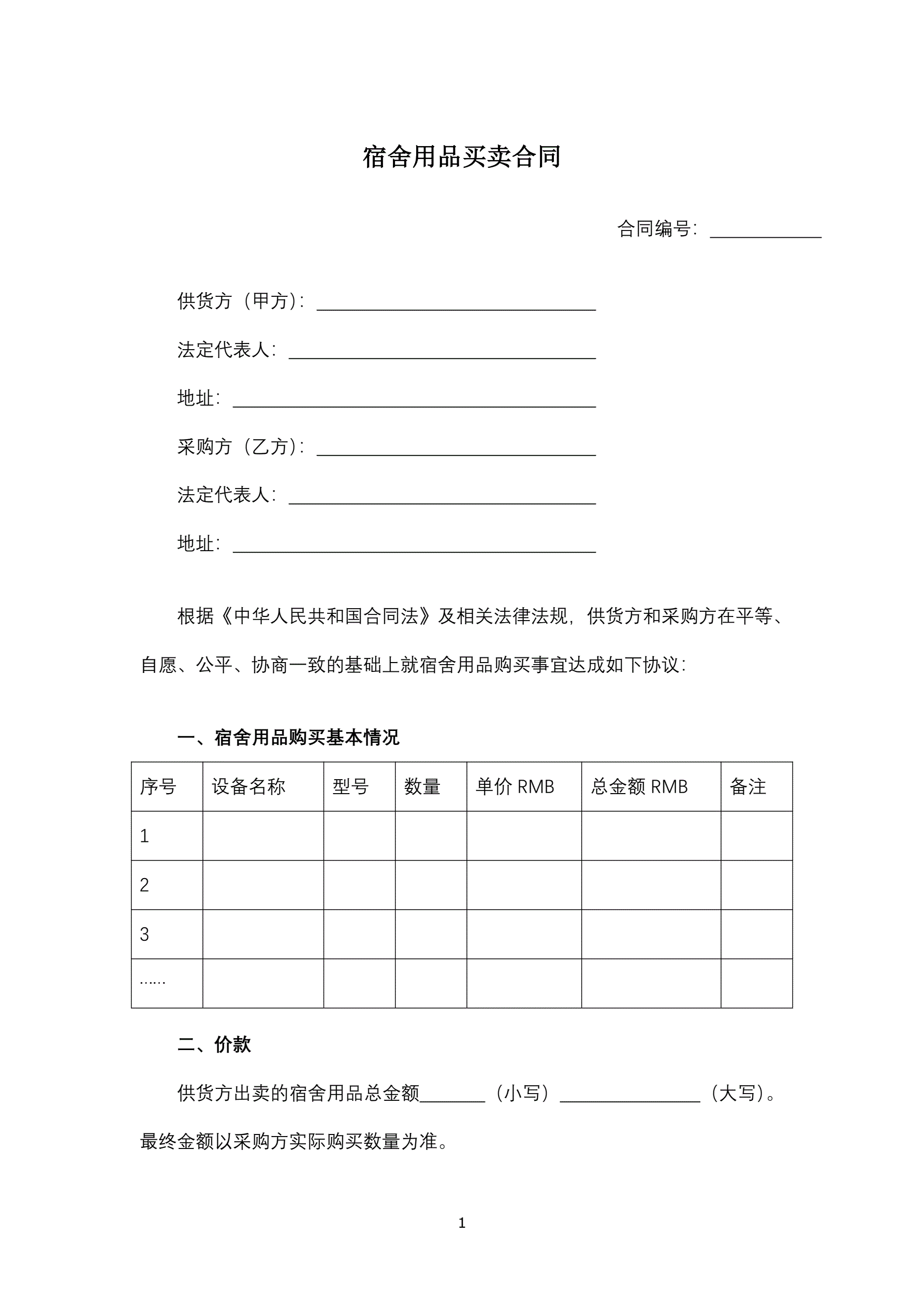 宿舍用品买卖合同
