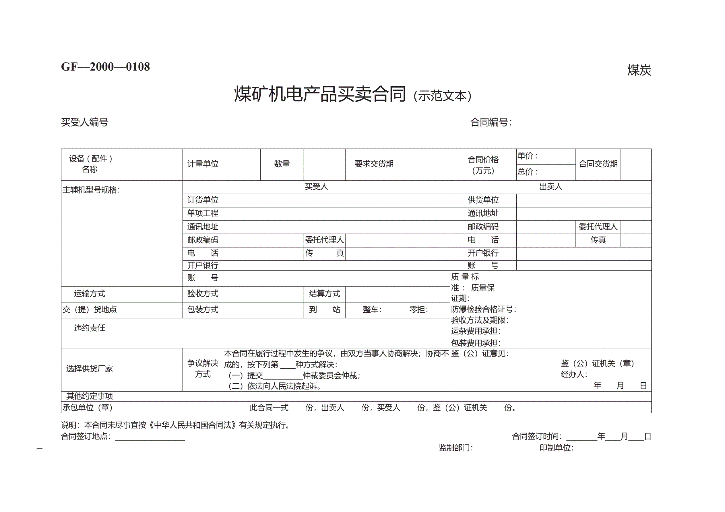 煤矿机电产品买卖合同 GF—2000—0108