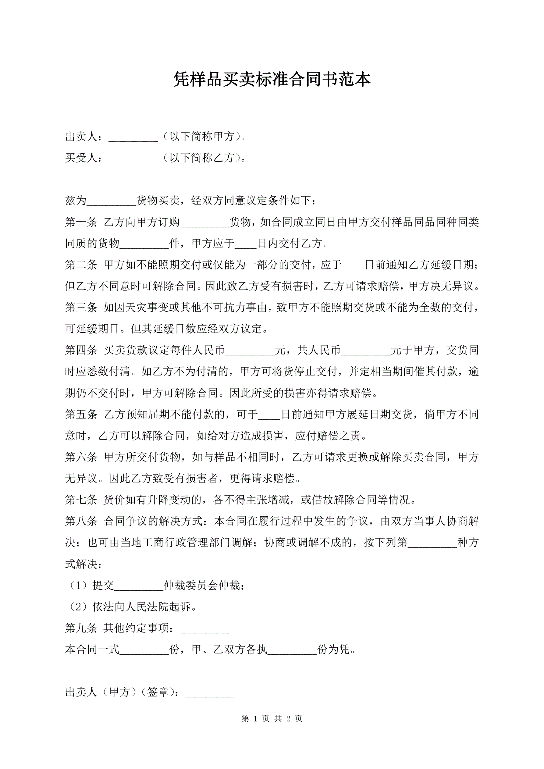 凭样品买卖标准合同书范本