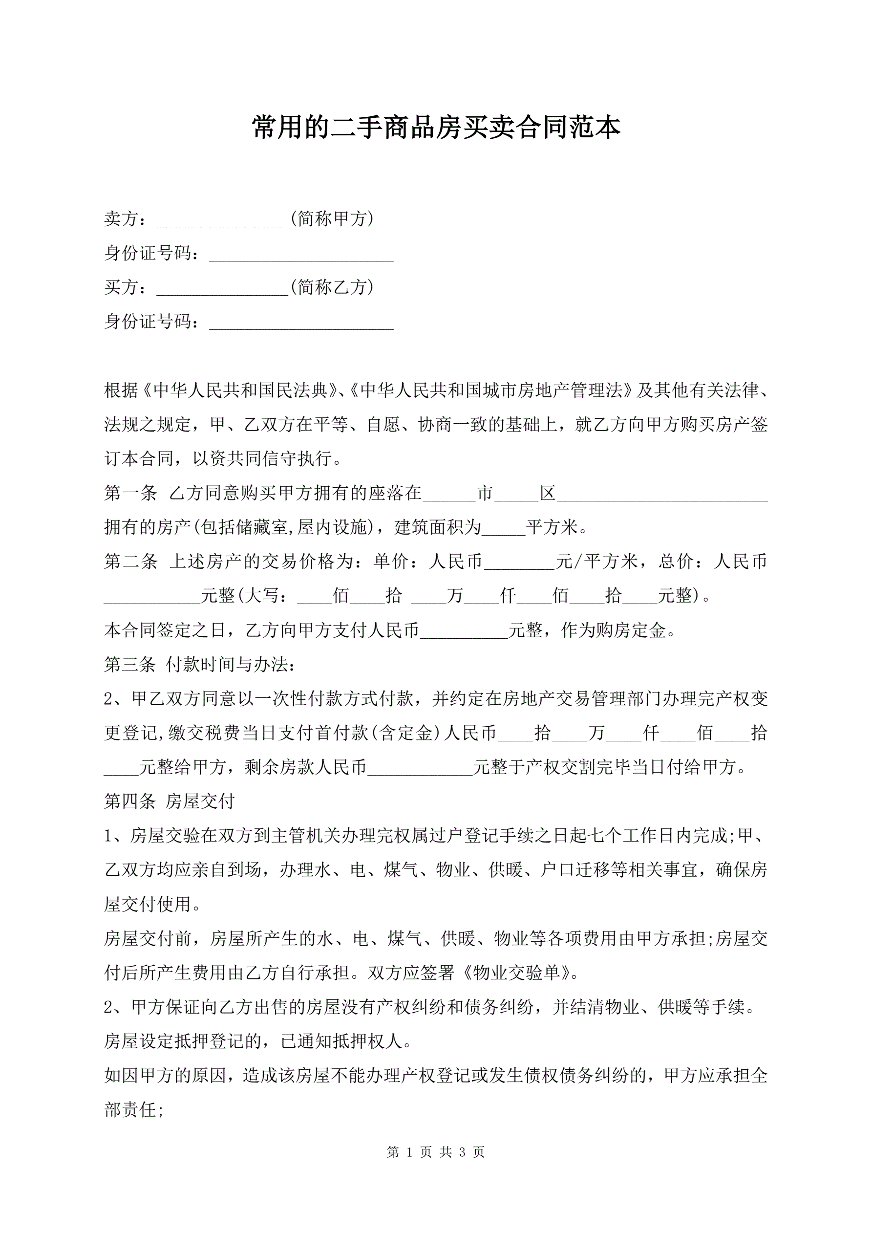 常用的二手商品房买卖合同范本