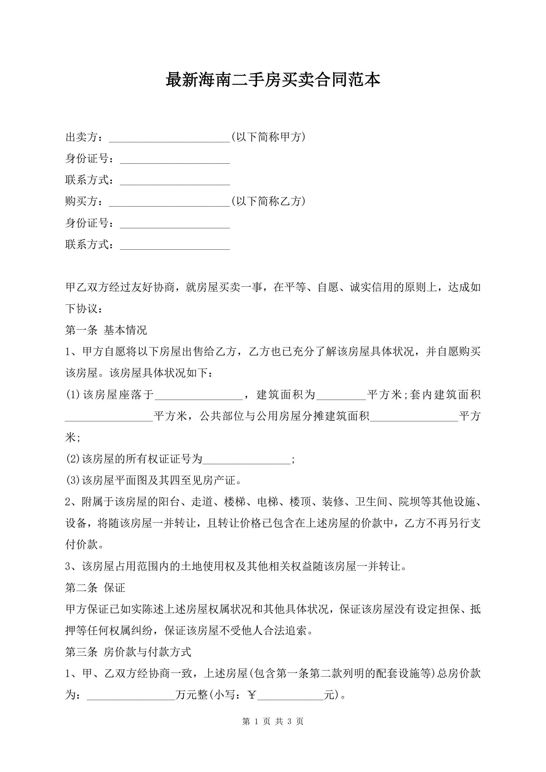最新海南二手房买卖合同范本