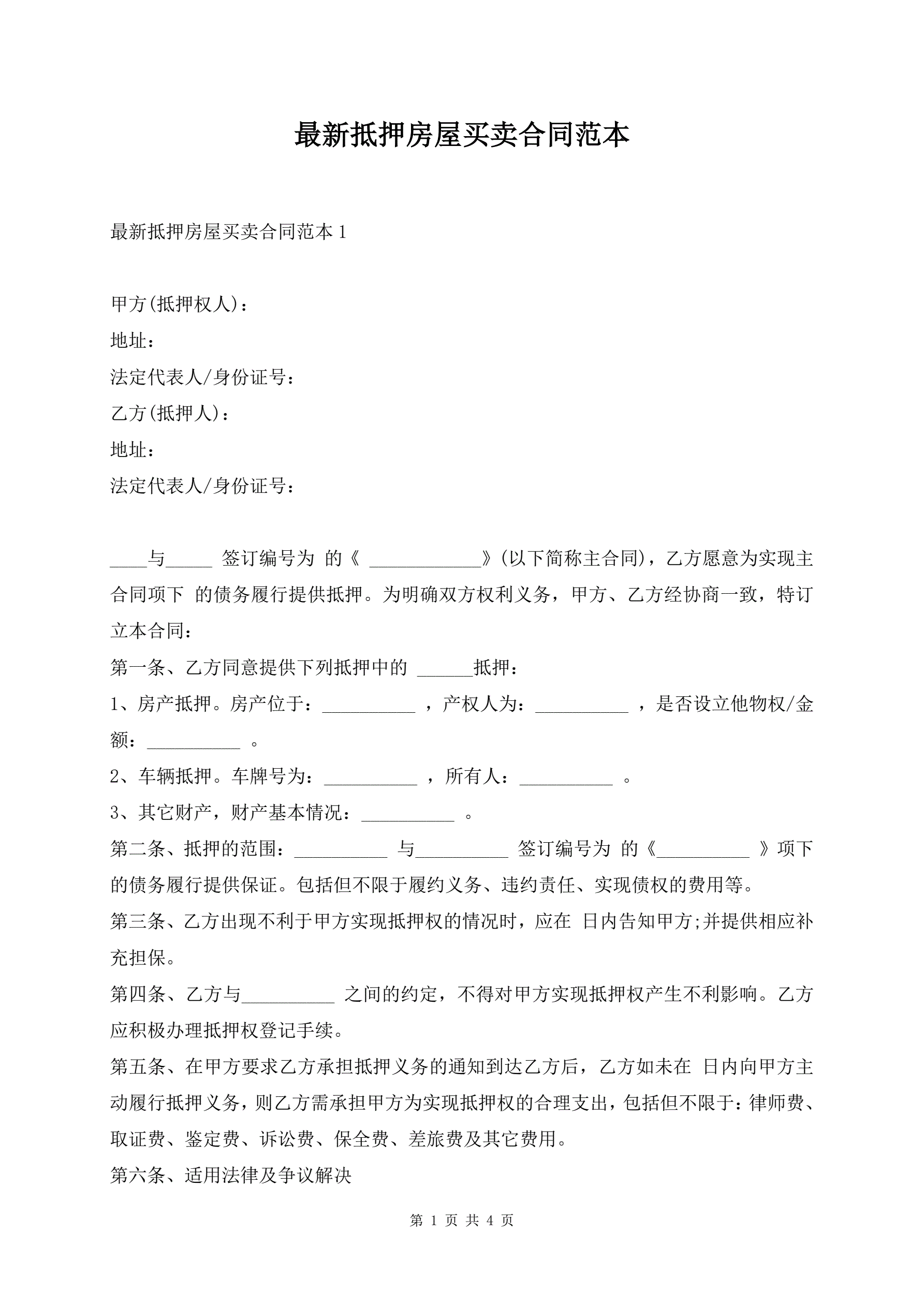 最新抵押房屋买卖合同范本