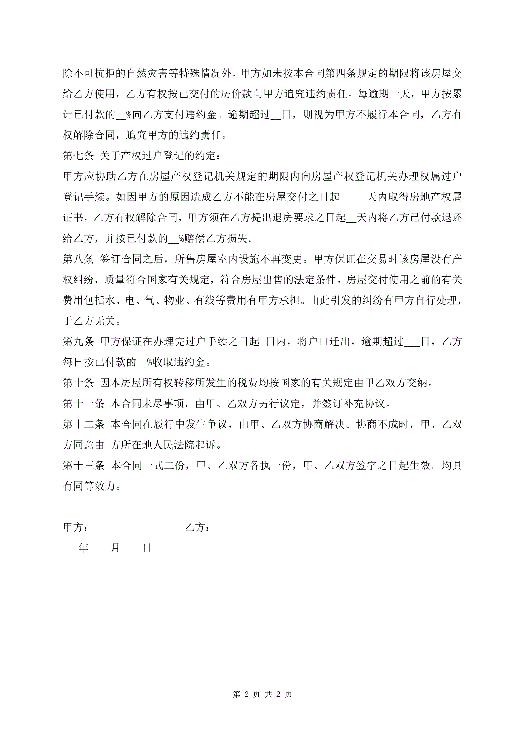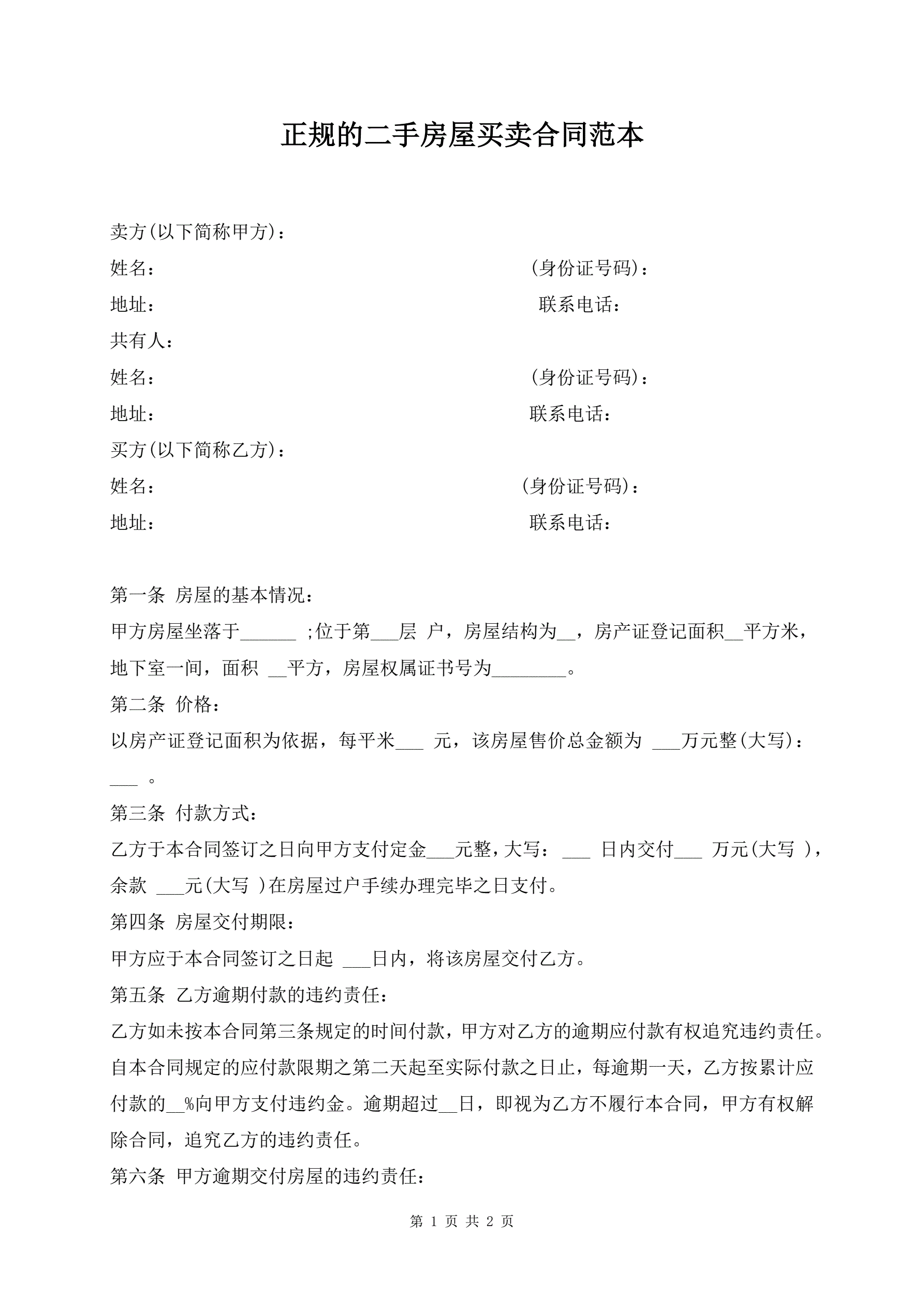 正规的二手房屋买卖合同范本