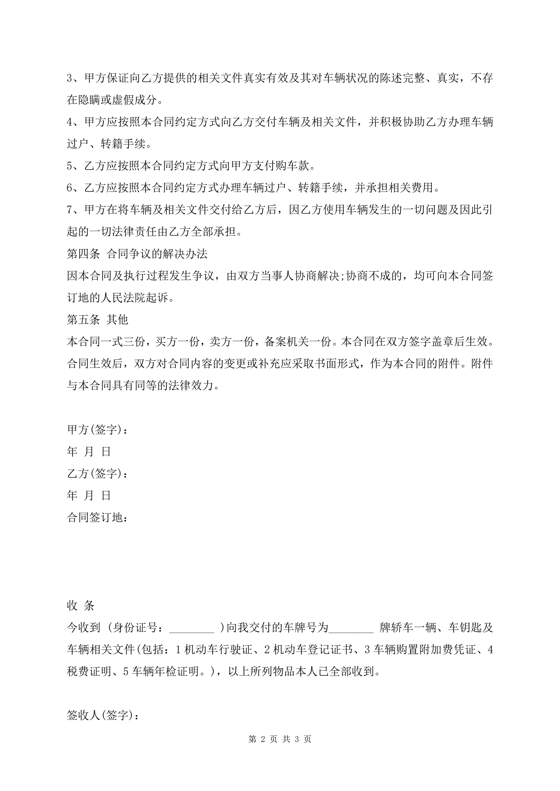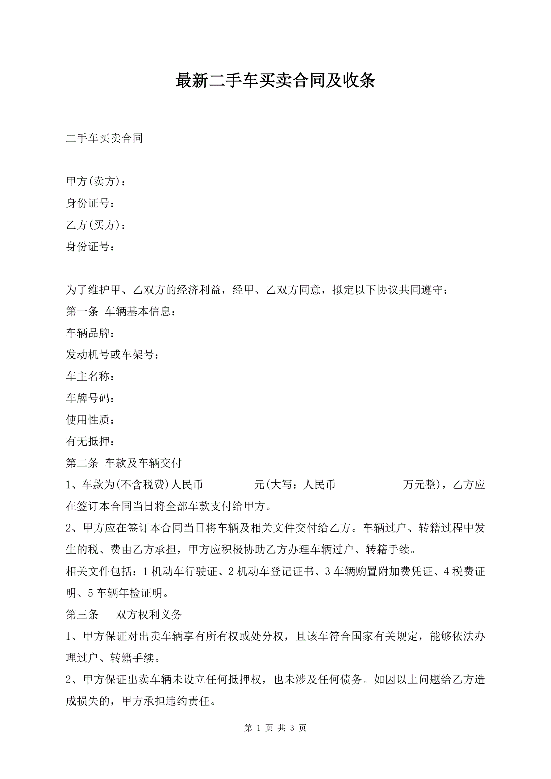 >最新二手车买卖合同及收条