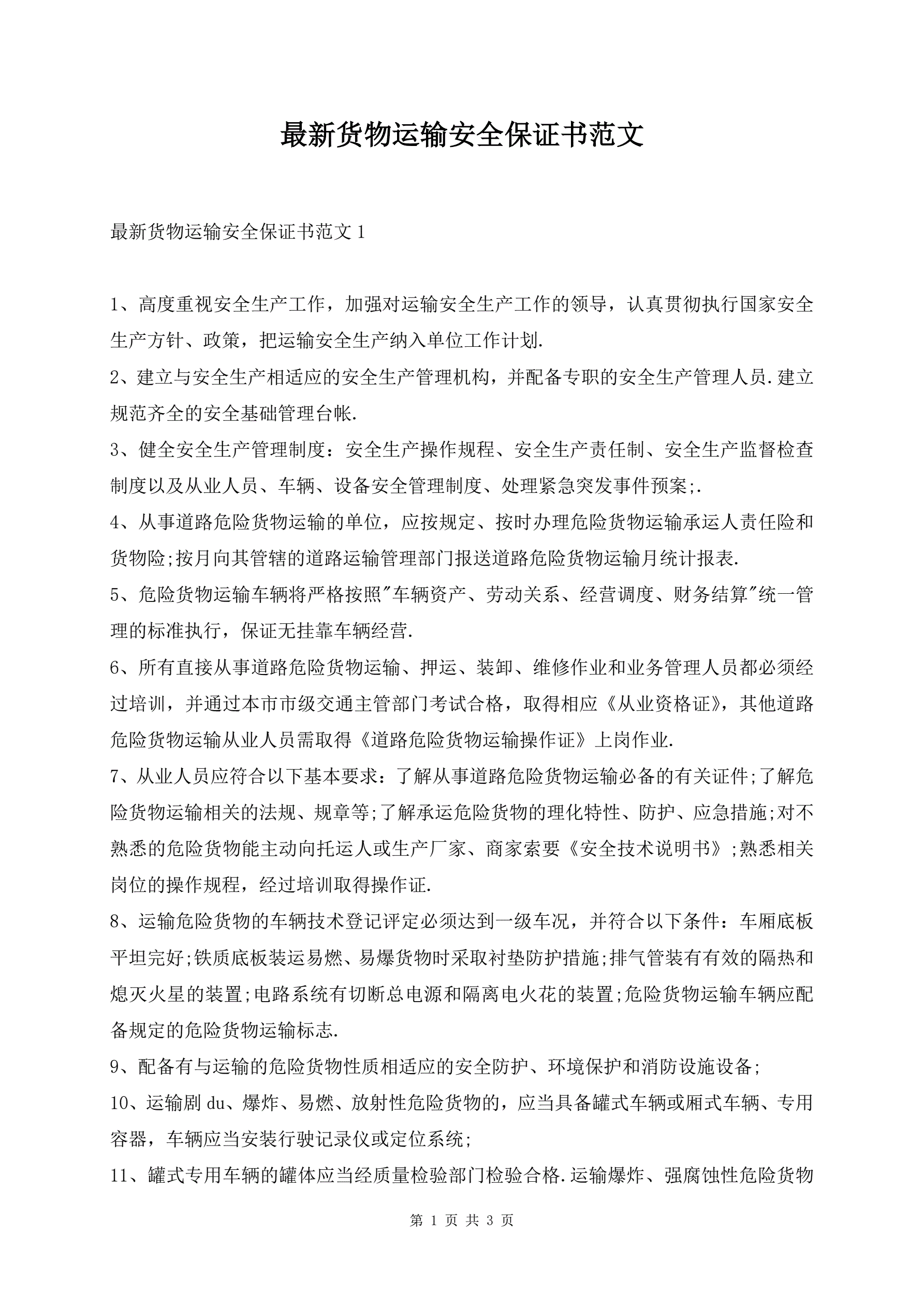 最新货物运输安全保证书范文