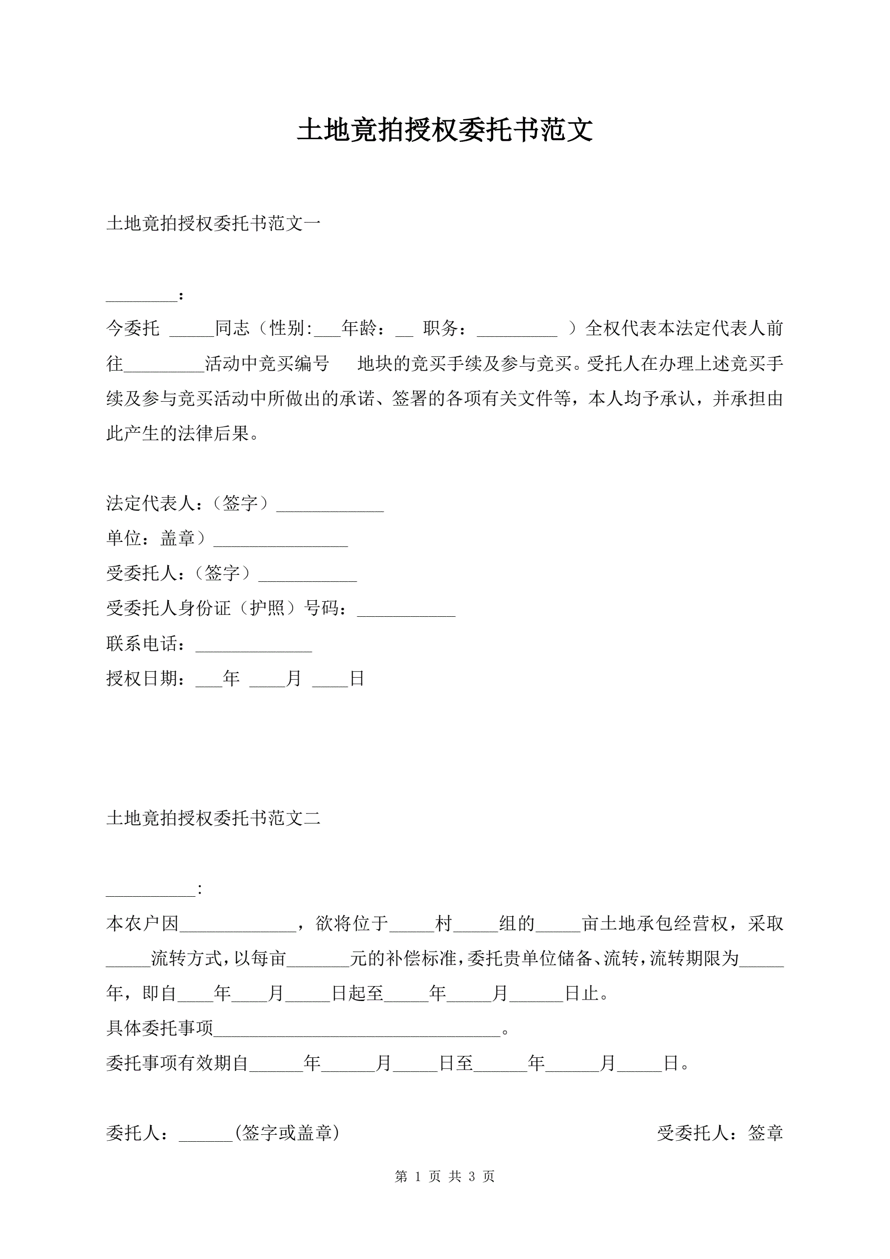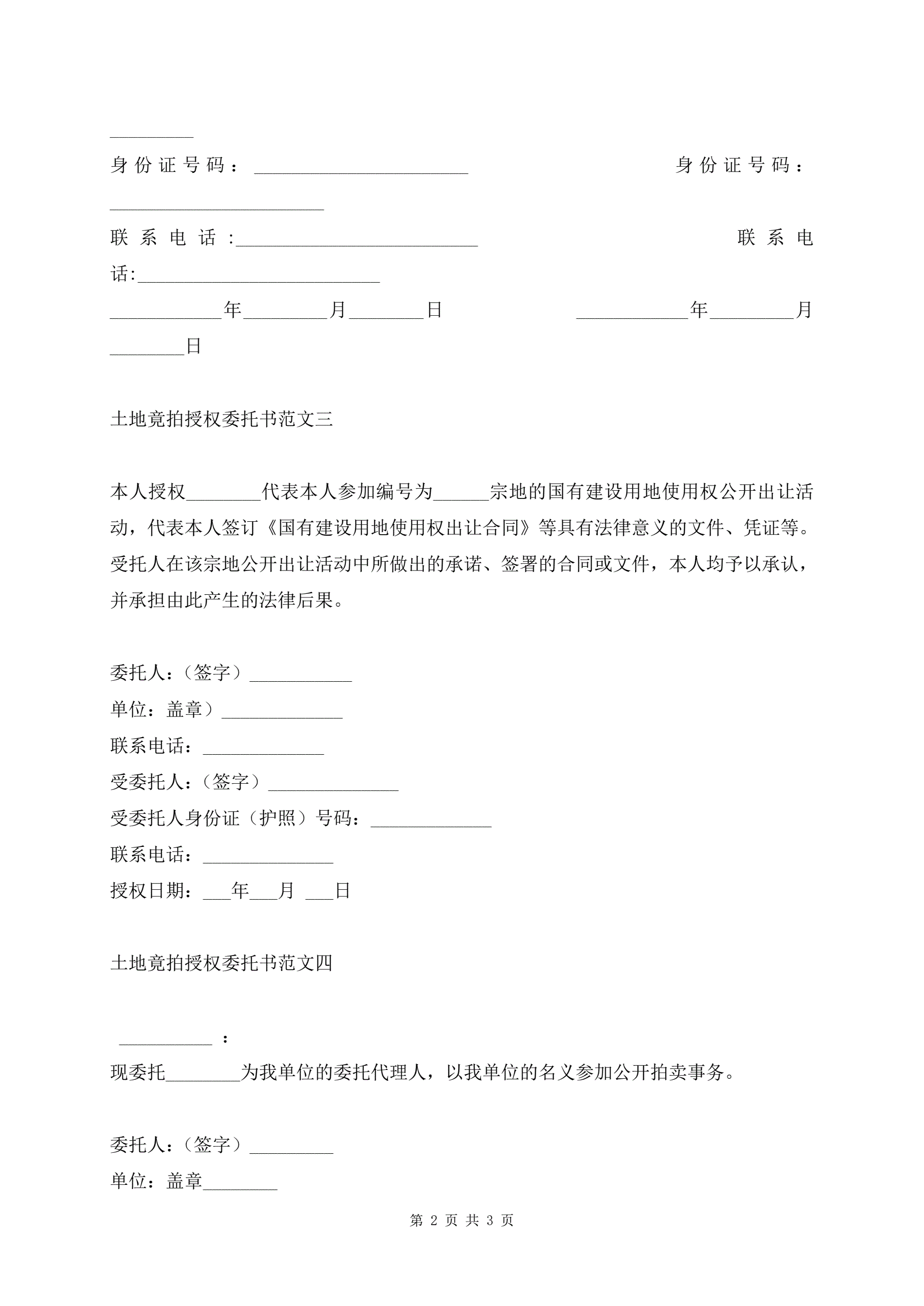 >土地竟拍授权委托书范文