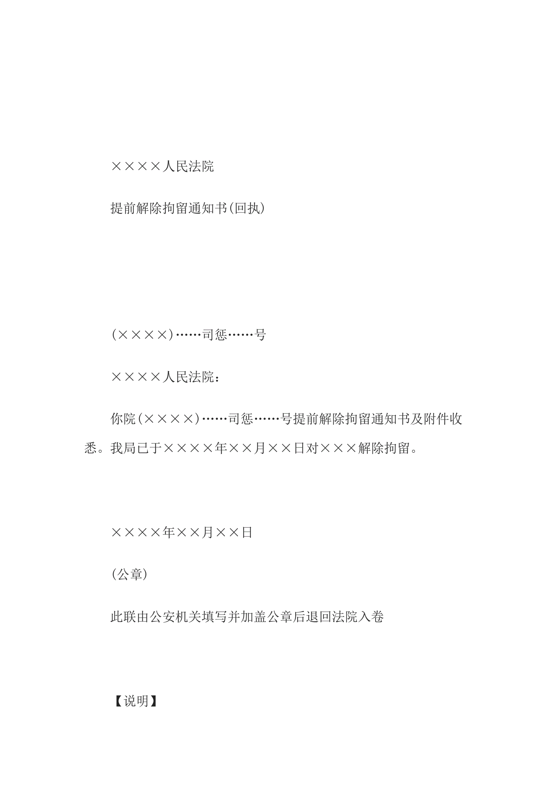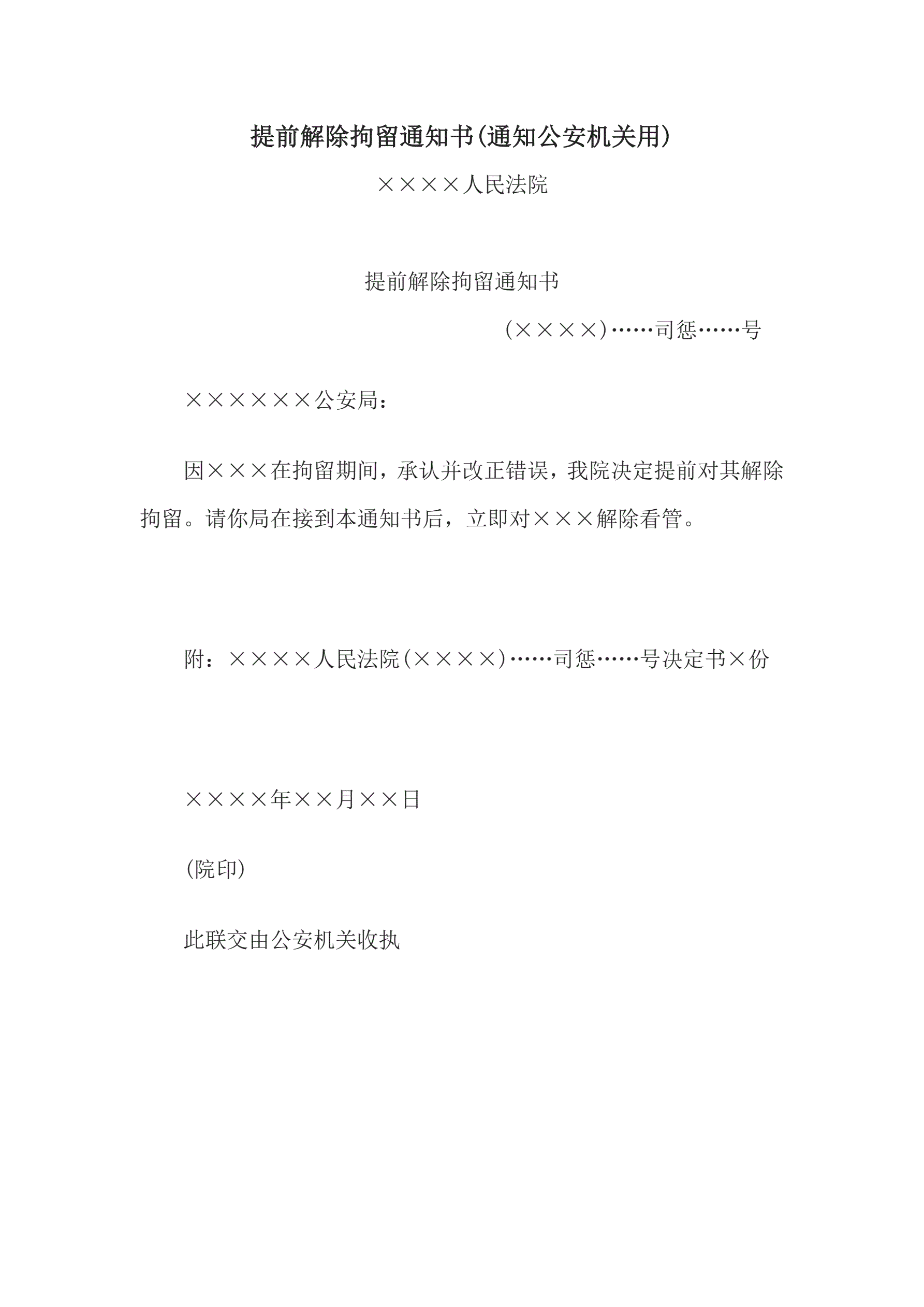 提前解除拘留通知书(通知公安机关用)