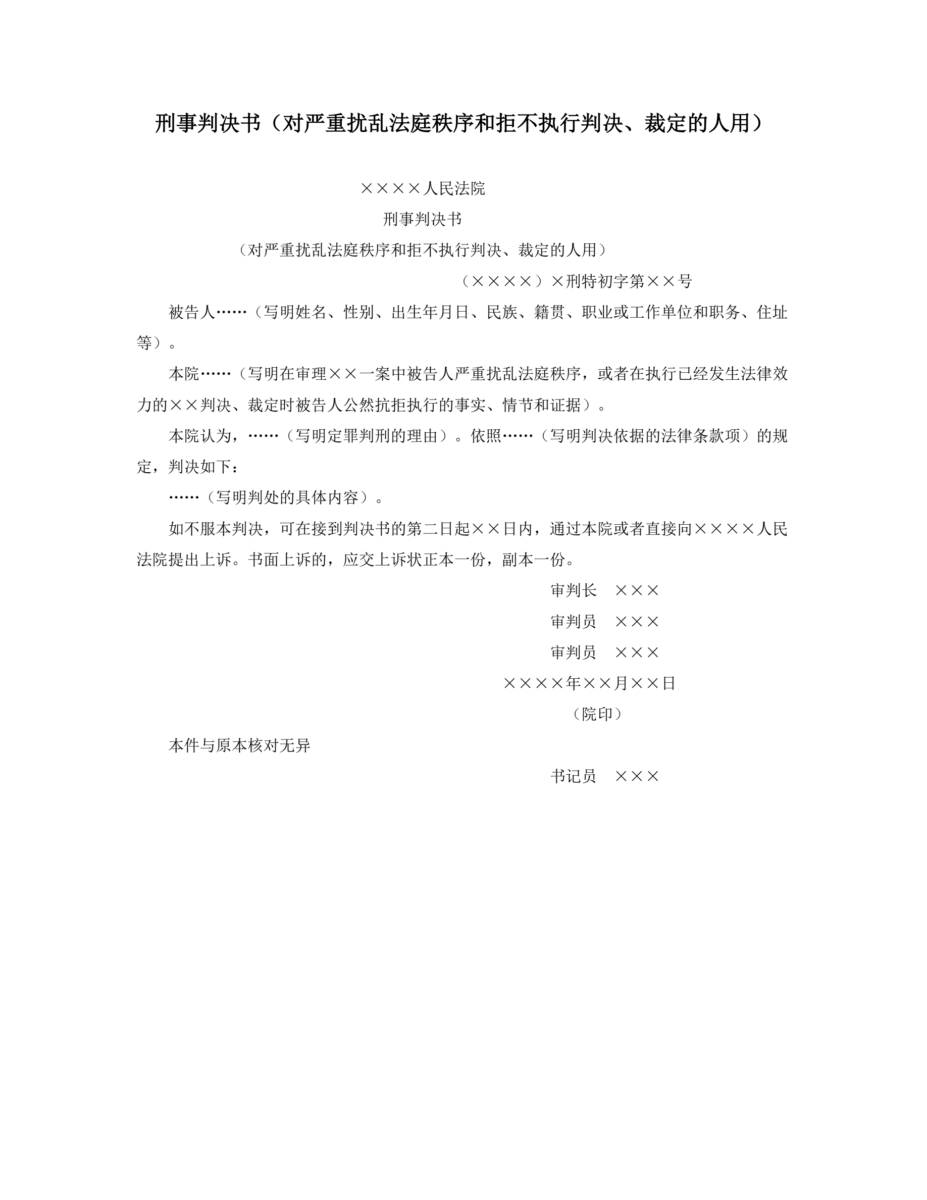 >刑事判决书(对严重扰乱法庭秩序和拒不执行判决、裁定的人用)