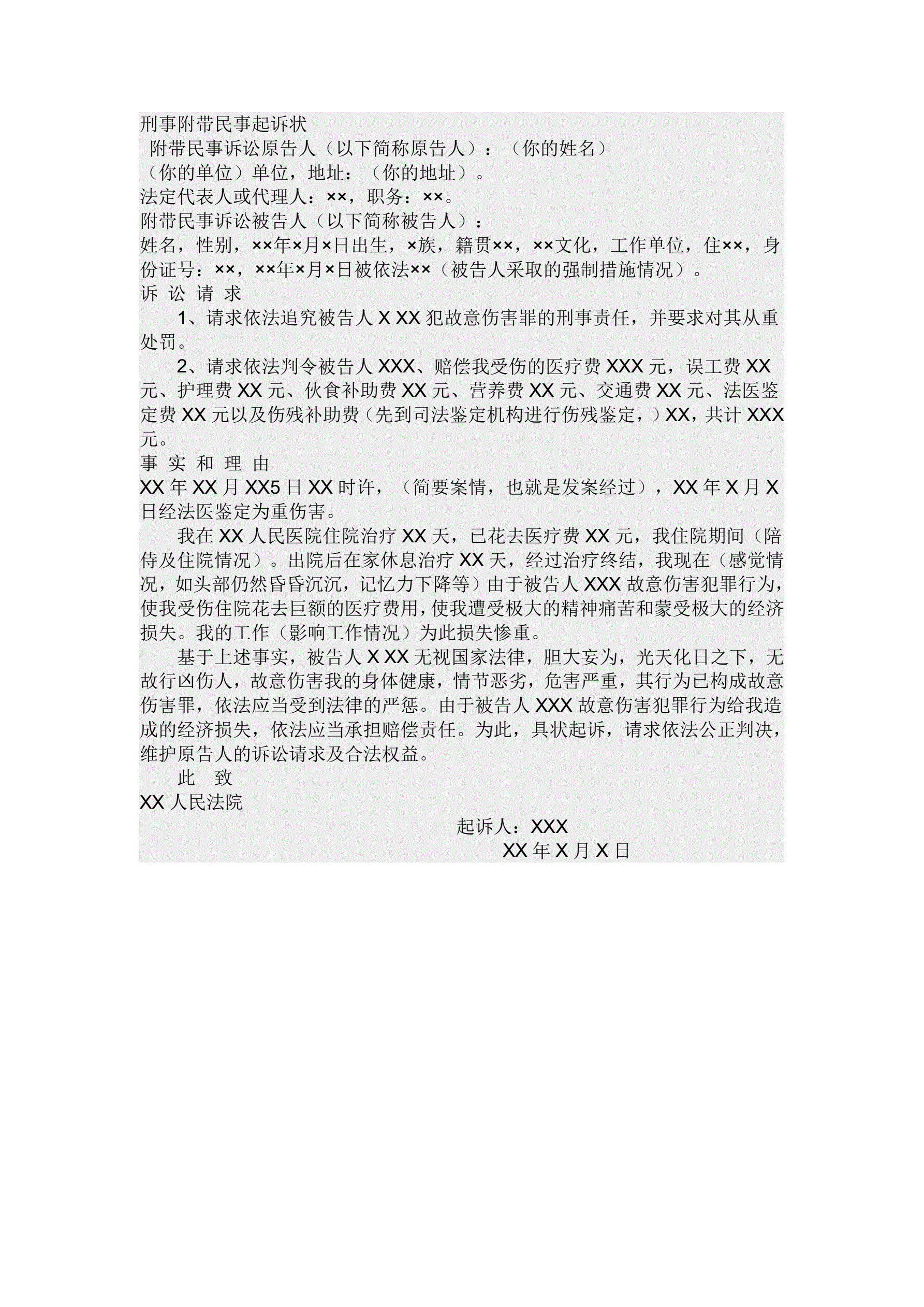 >刑事附带民事起诉状范本