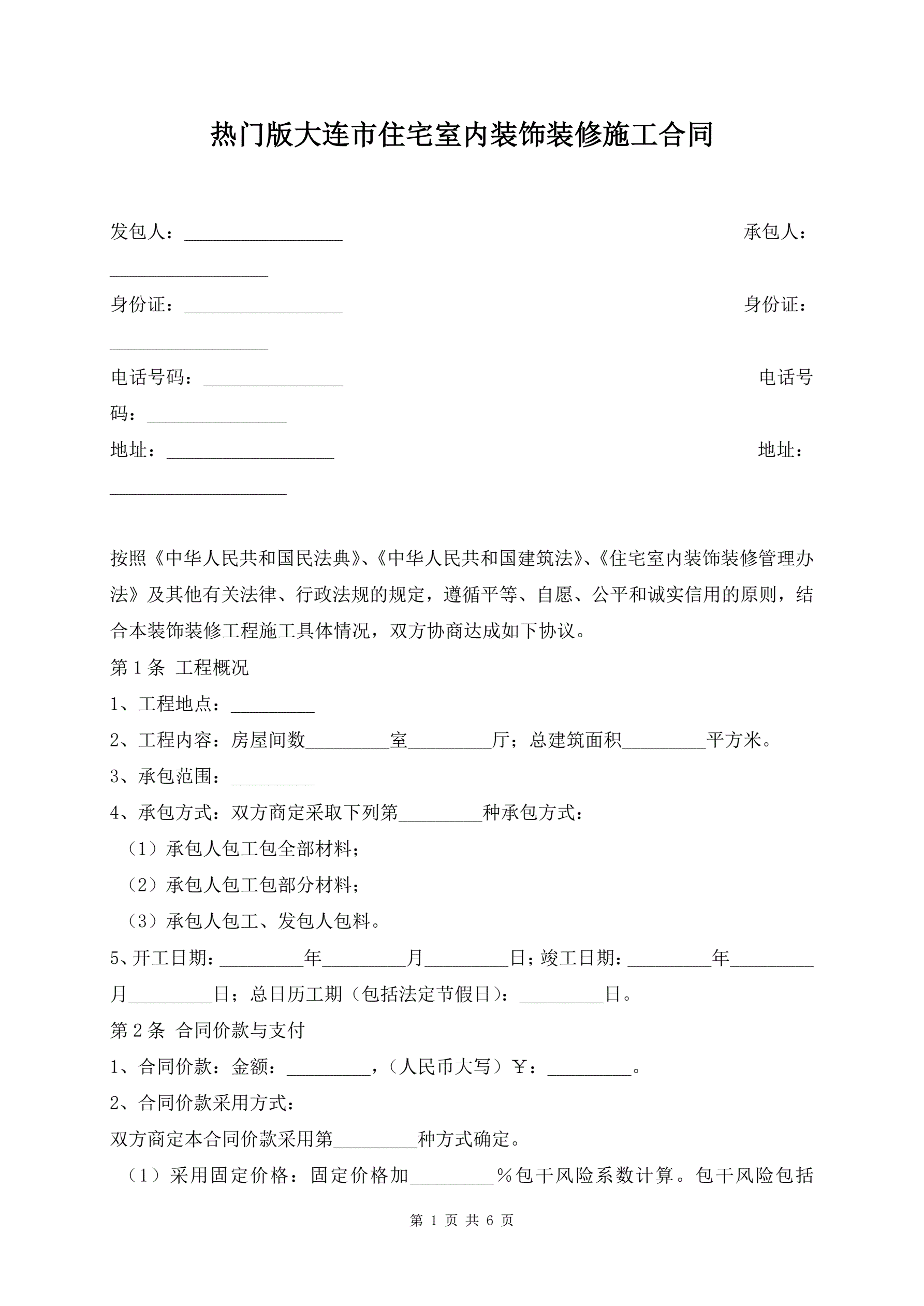 热门版大连市住宅室内装饰装修施工合同