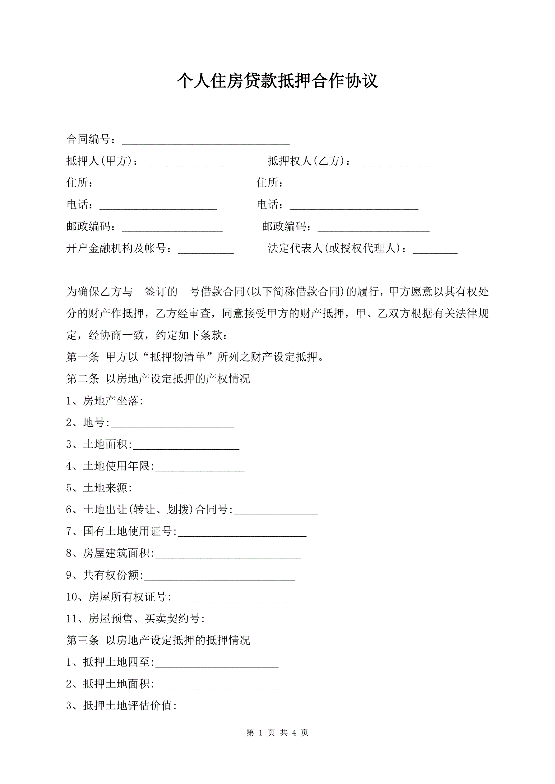 >个人住房贷款抵押合作协议