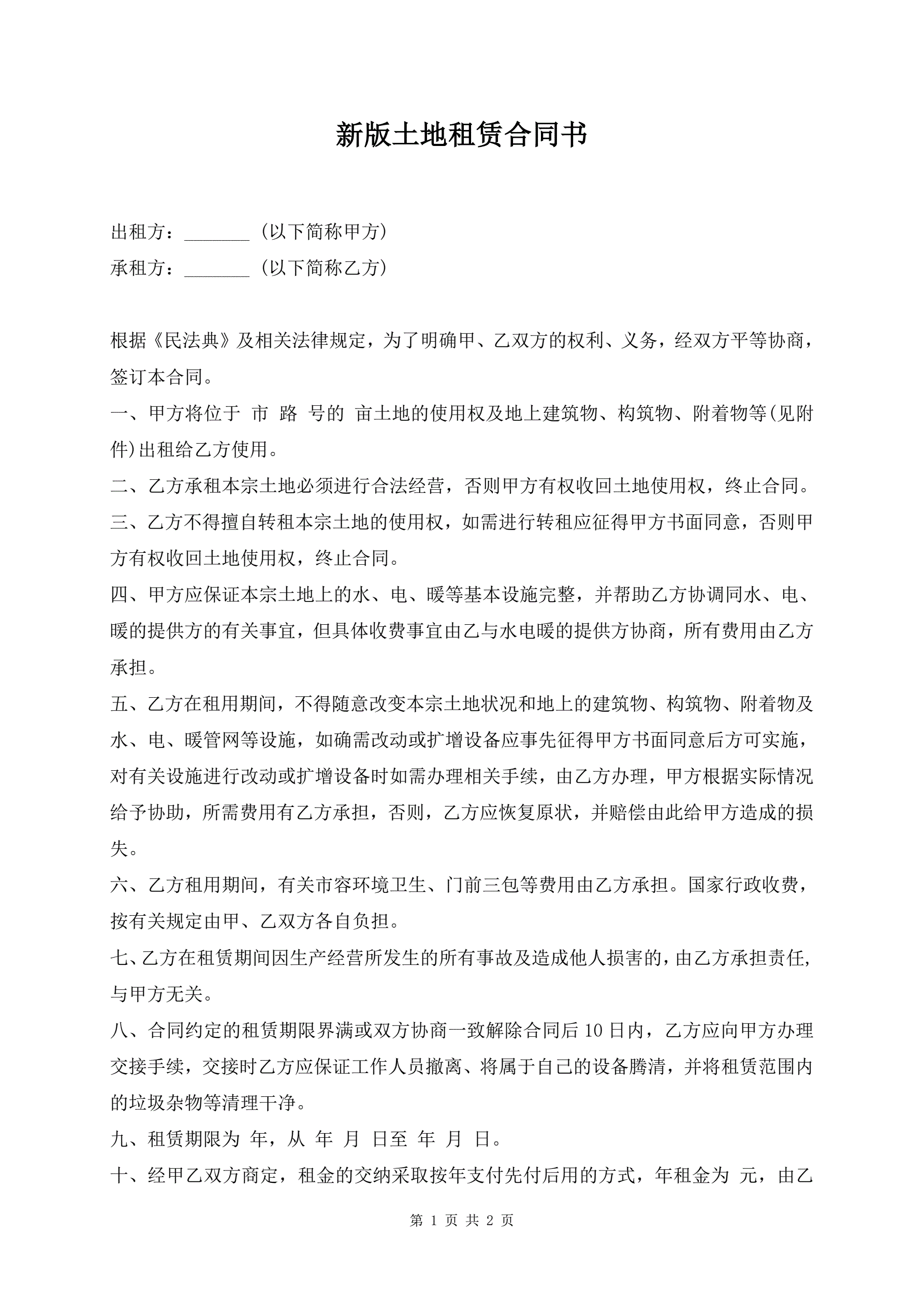 新版土地租赁合同书