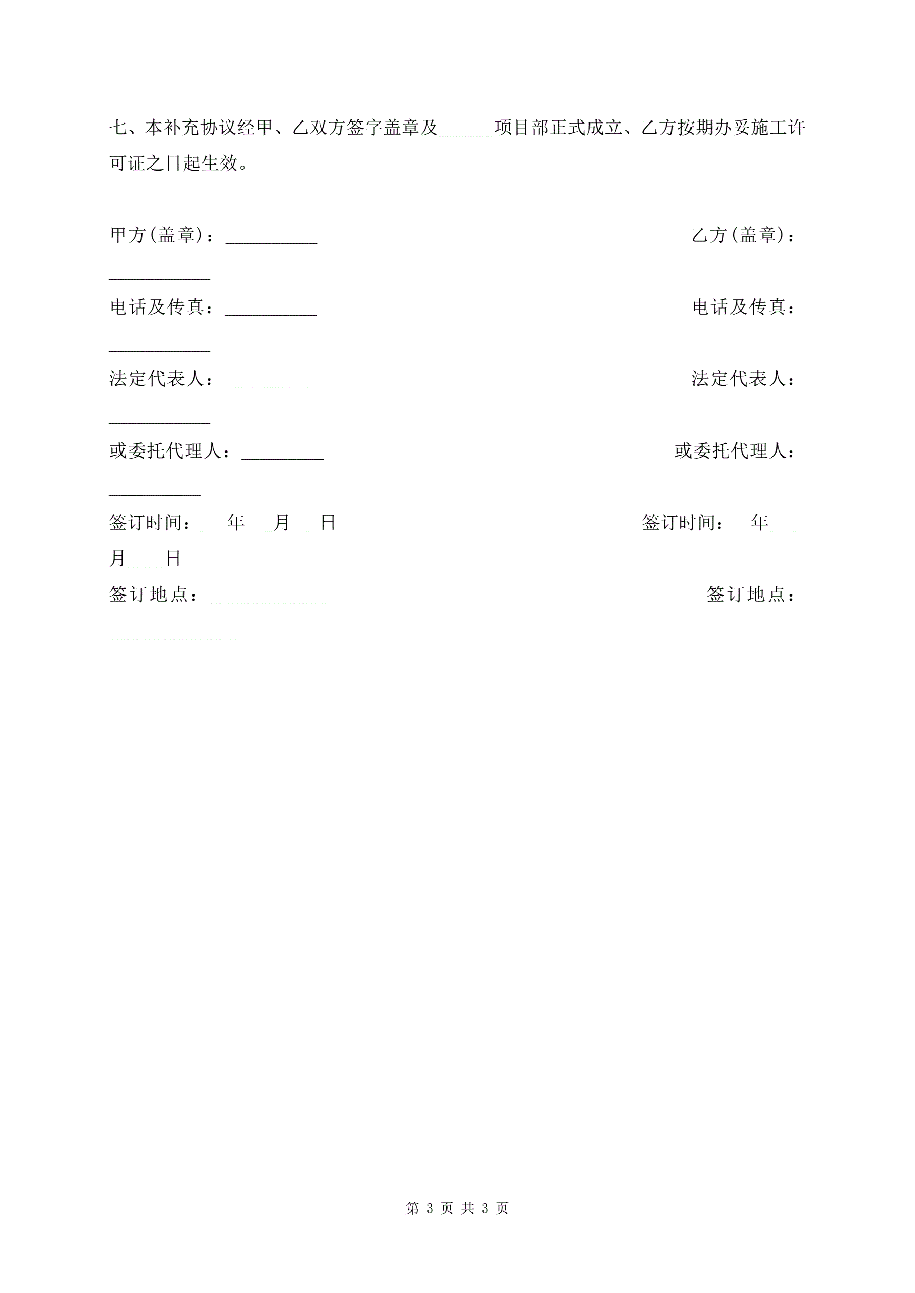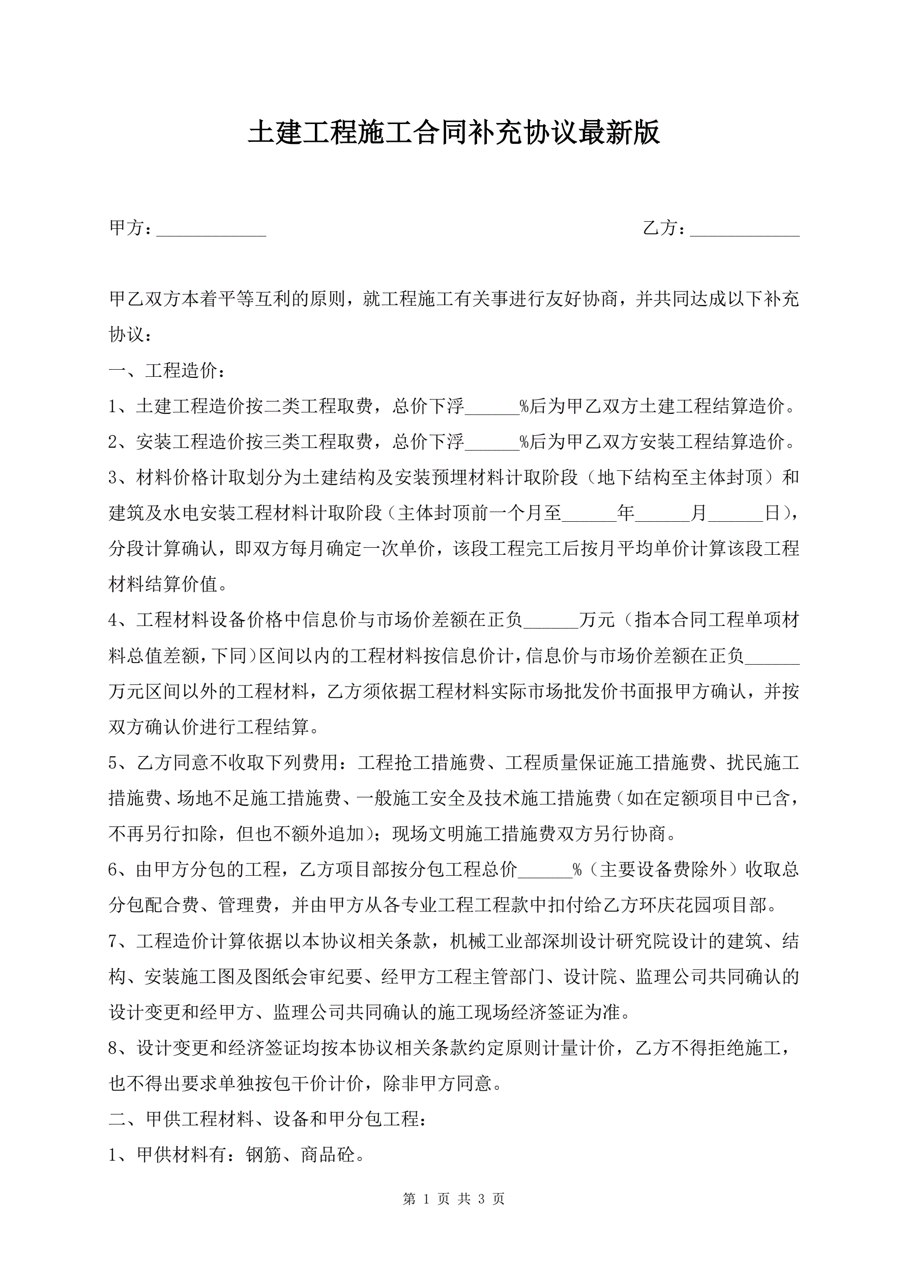 >土建工程施工合同补充协议最新版