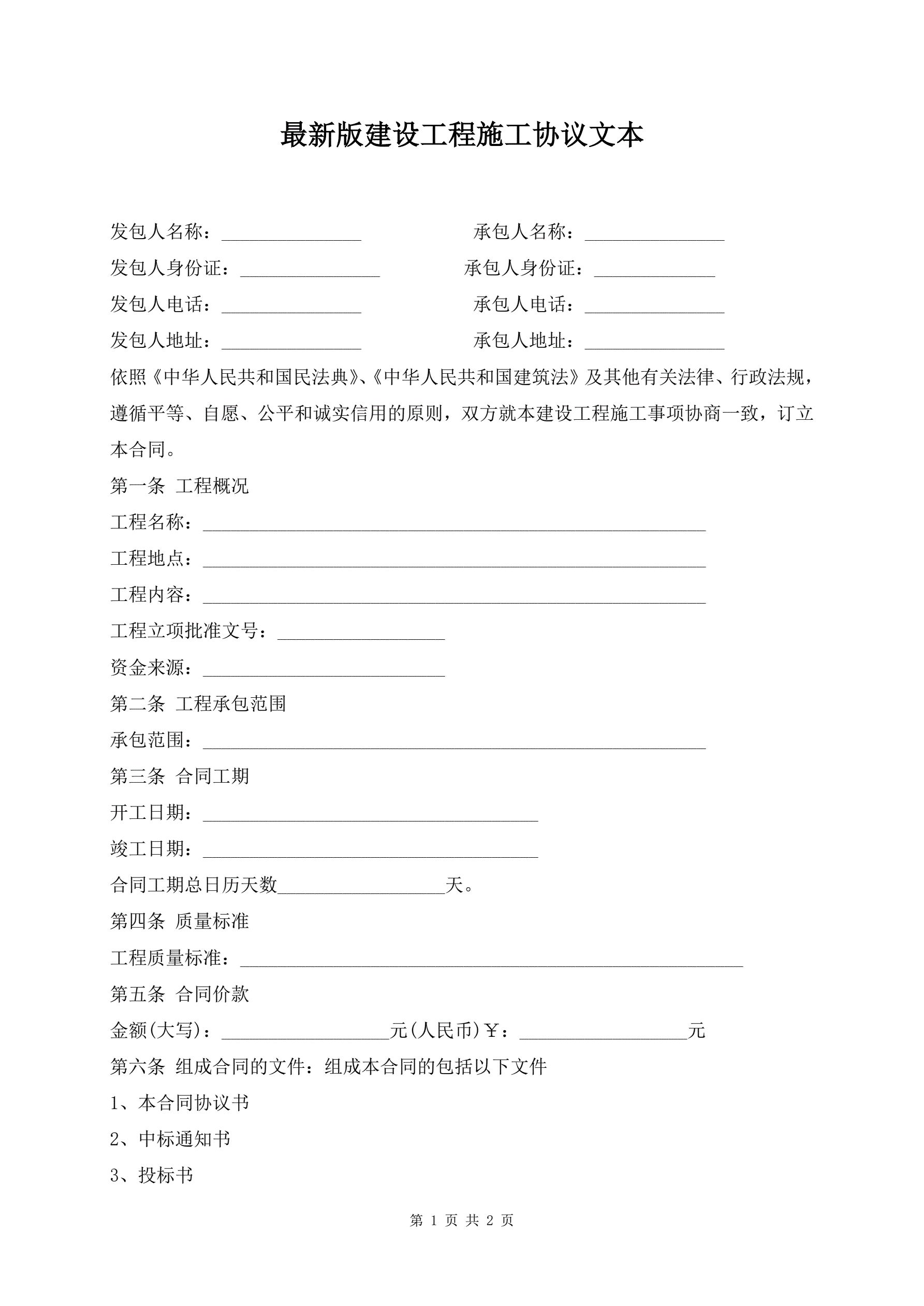 >最新版建设工程施工协议文本