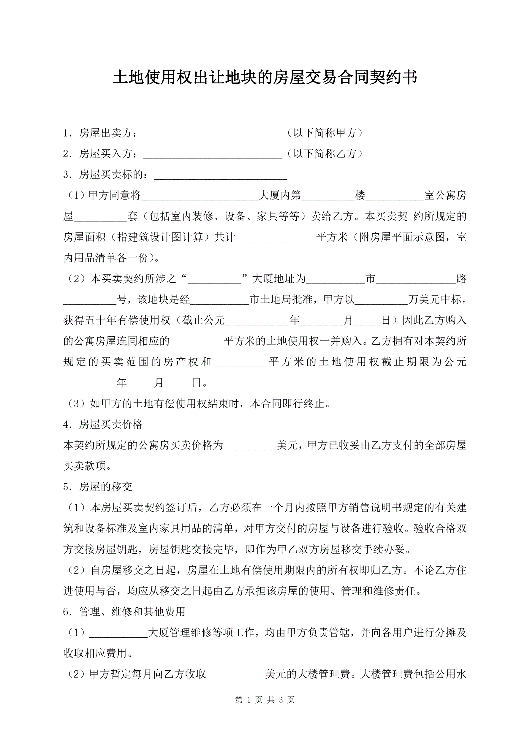 >土地使用权出让地块的房屋交易合同契约书