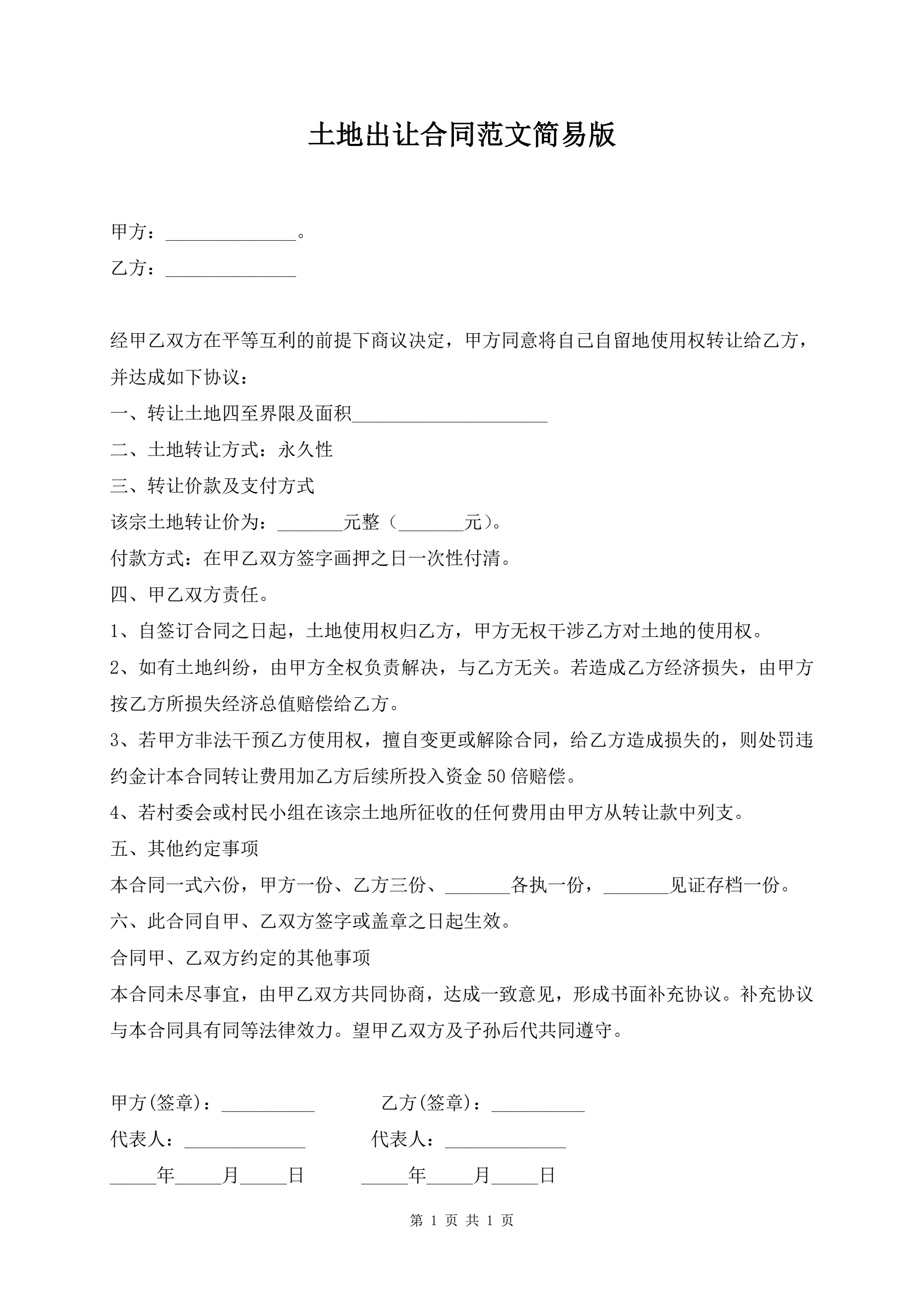 土地出让合同范文简易版