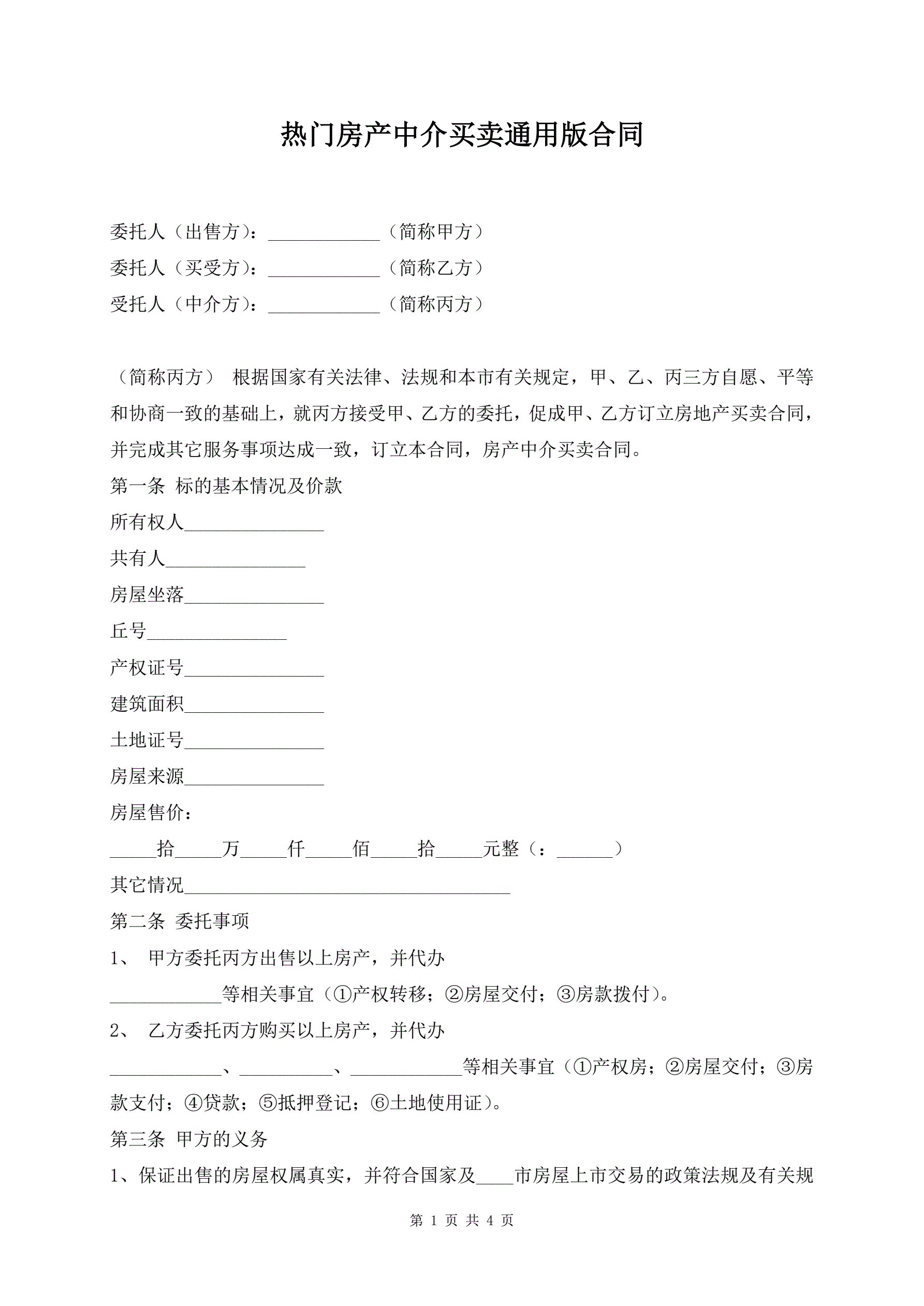 >热门房产中介买卖通用版合同