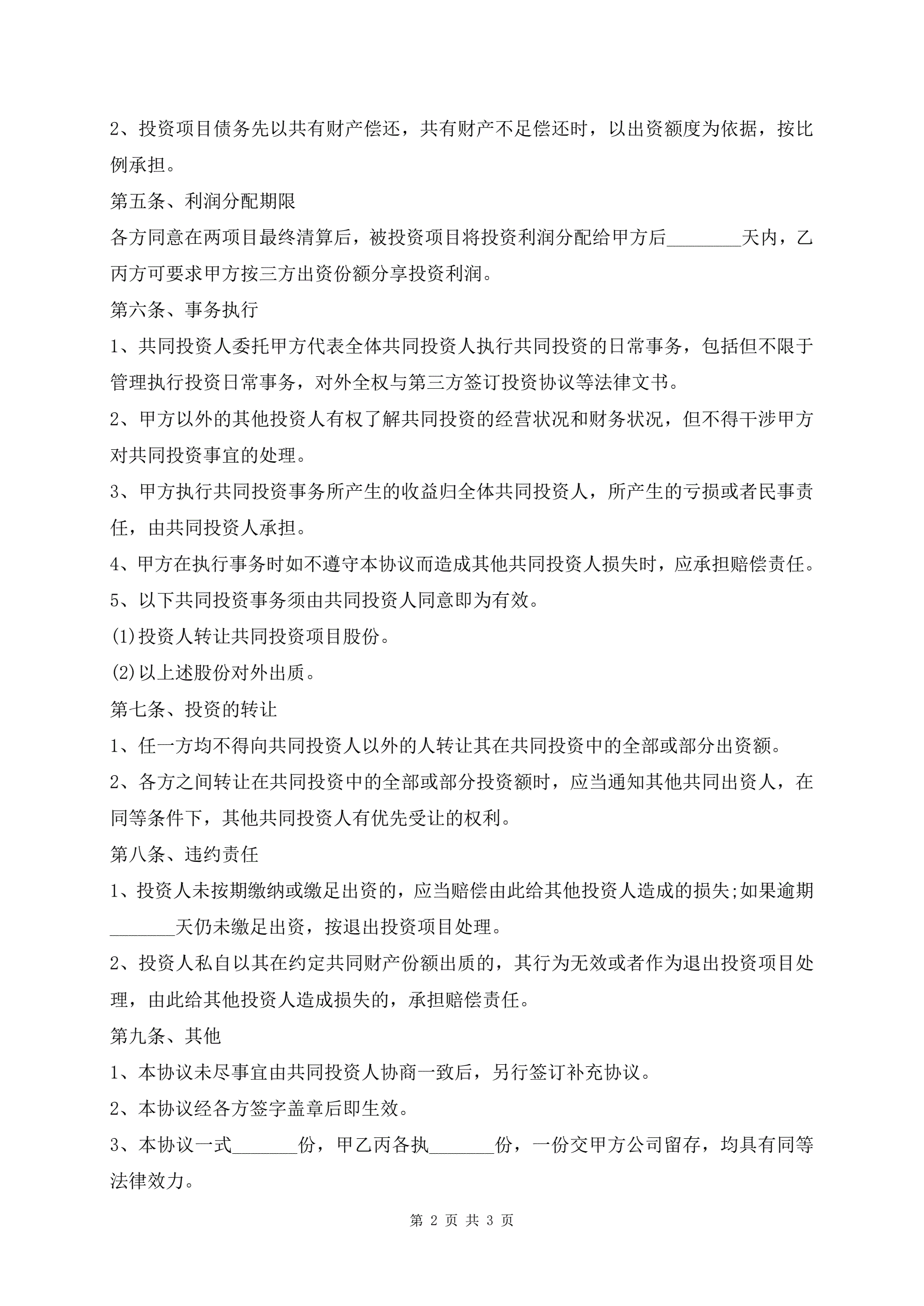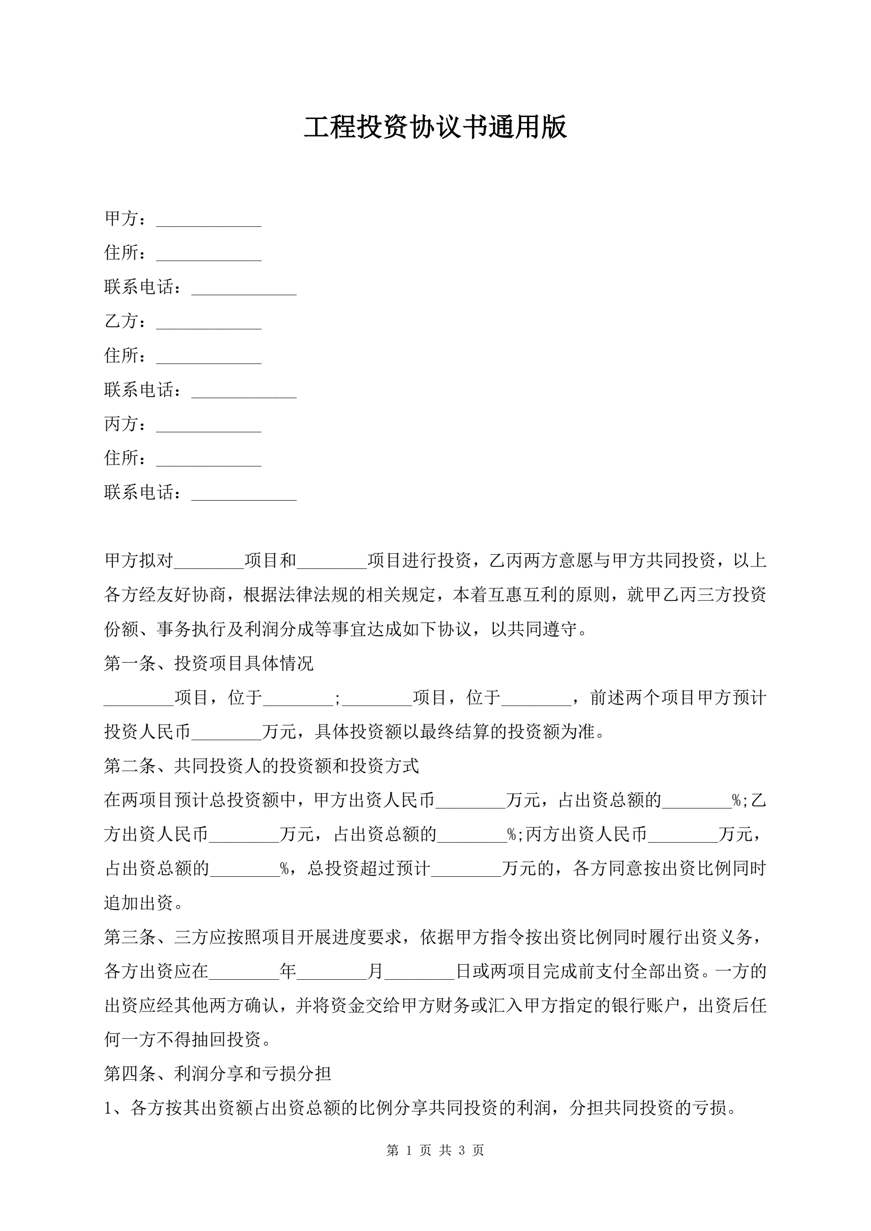>工程投资协议书通用版