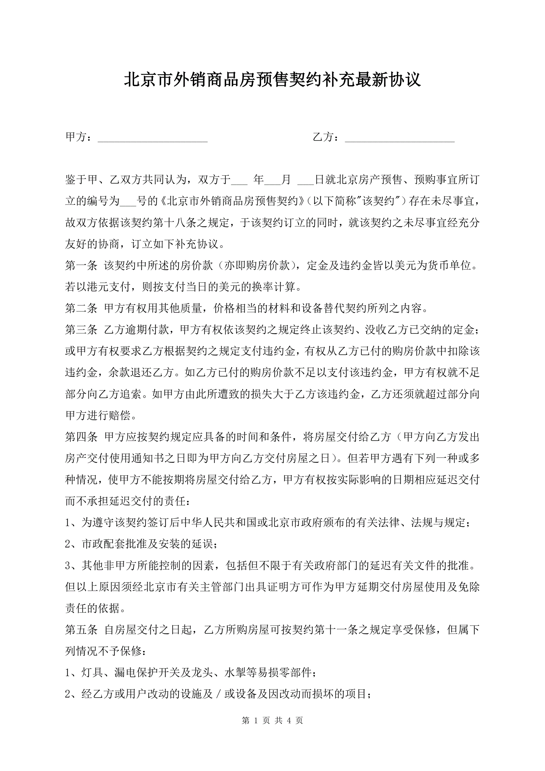 >北京市外销商品房预售契约补充最新协议
