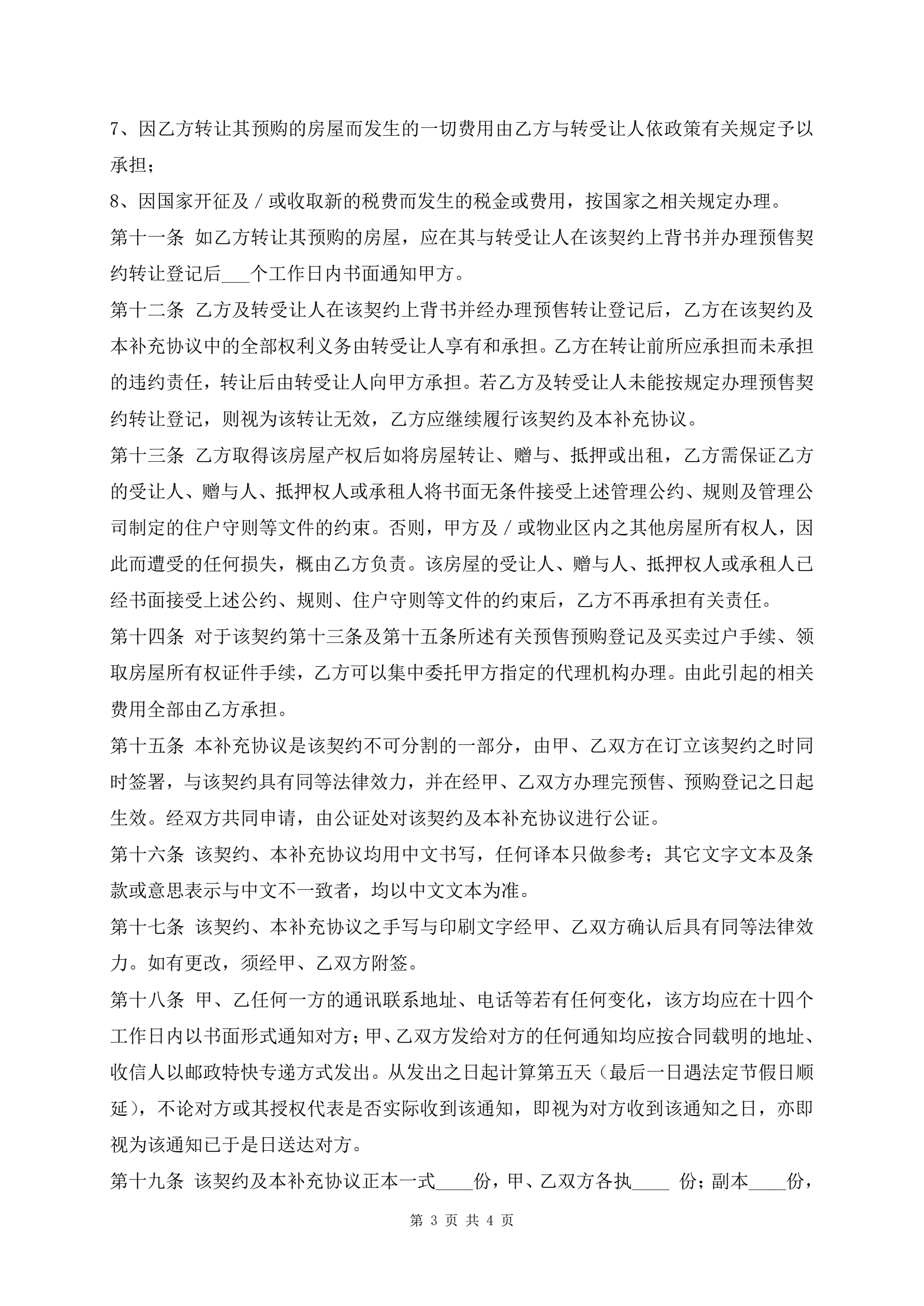 北京市外销商品房预售契约补充最新协议