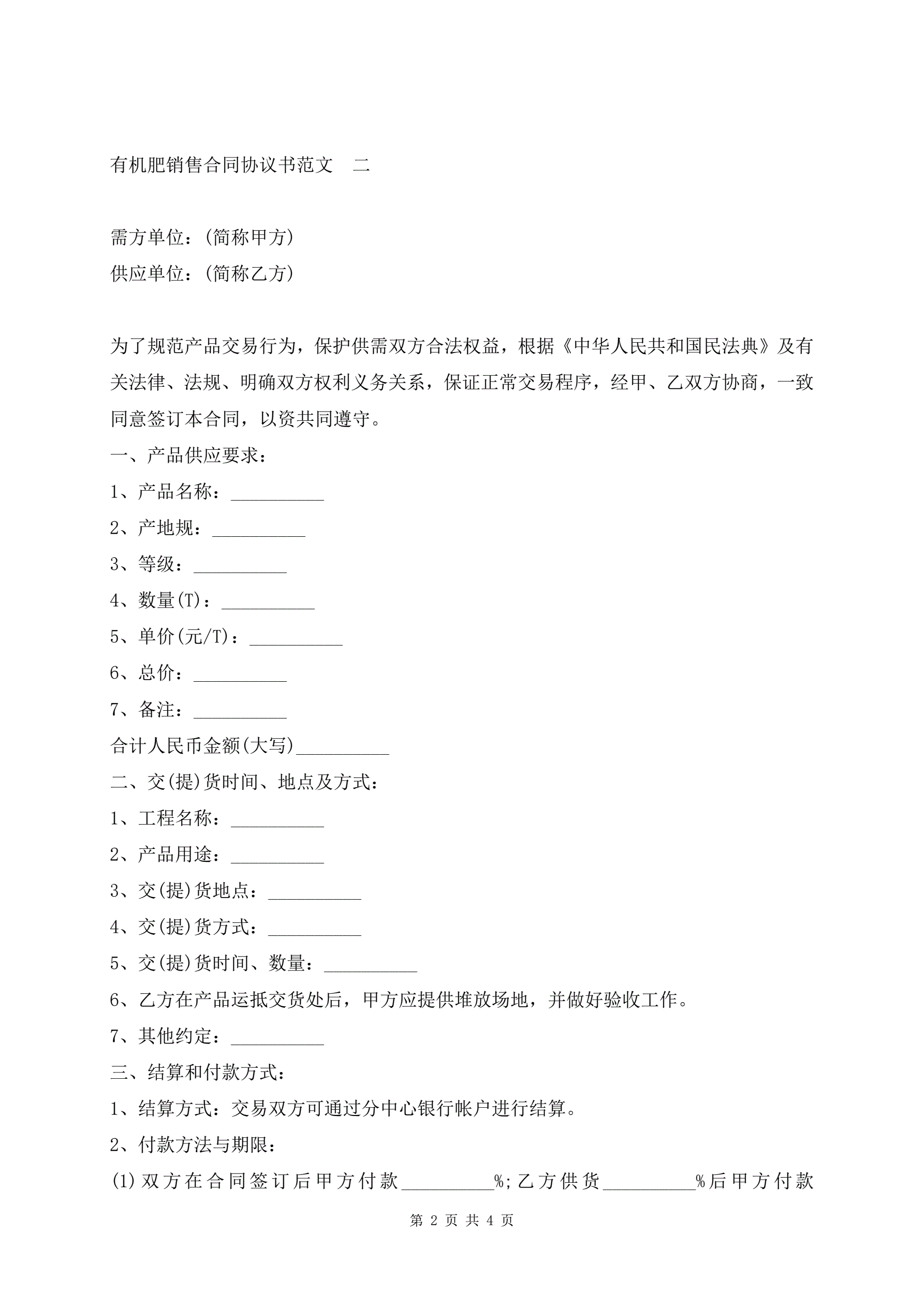 >有机肥销售合同协议书范文