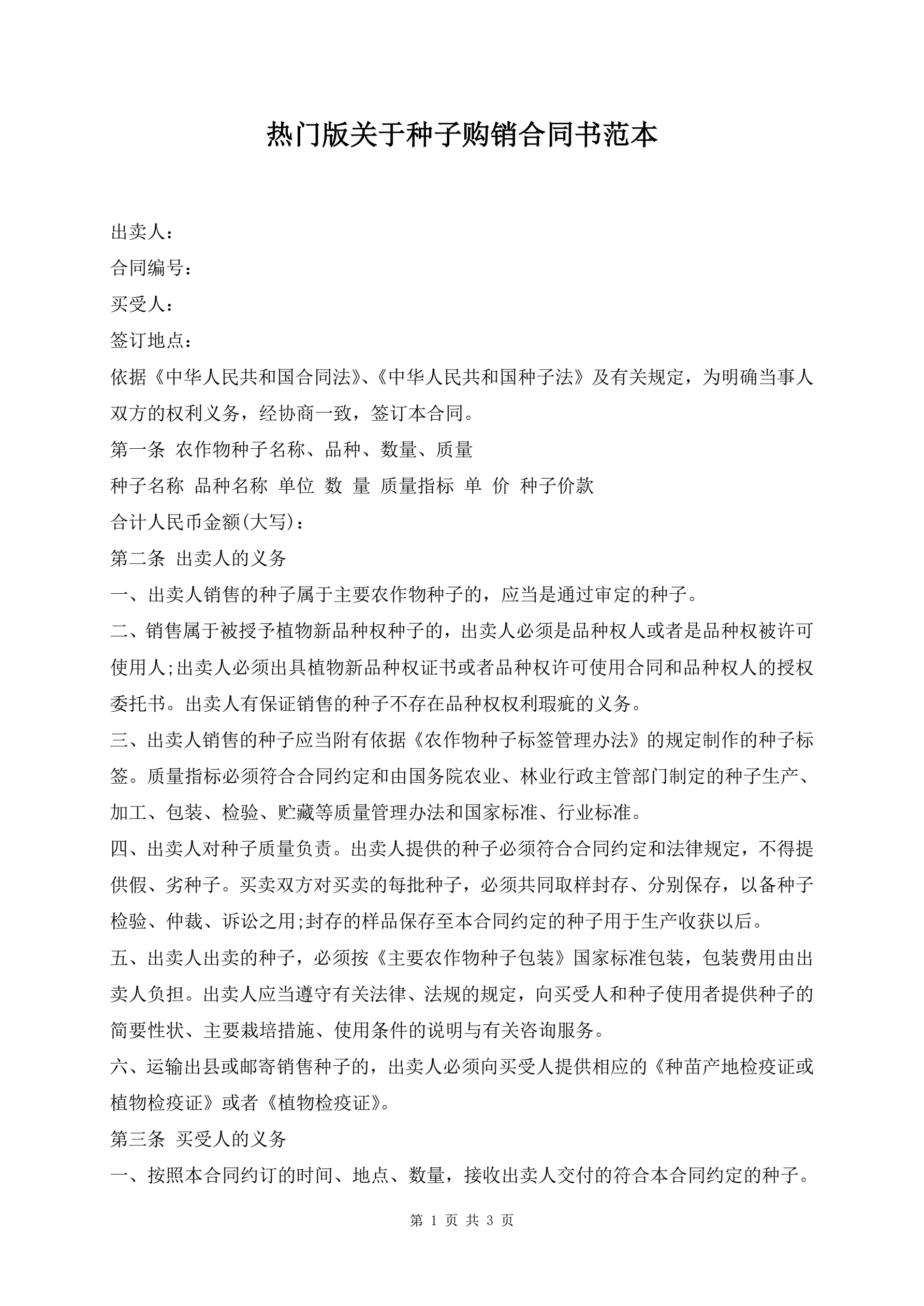 >热门版关于种子购销合同书范本