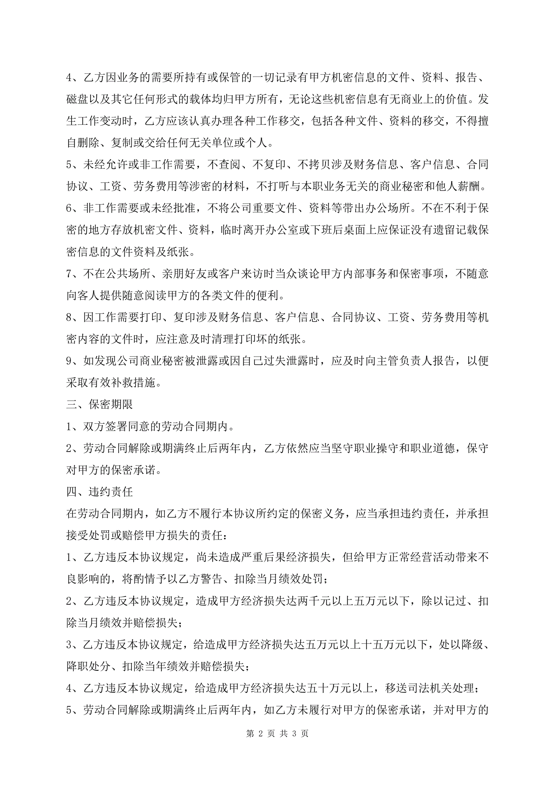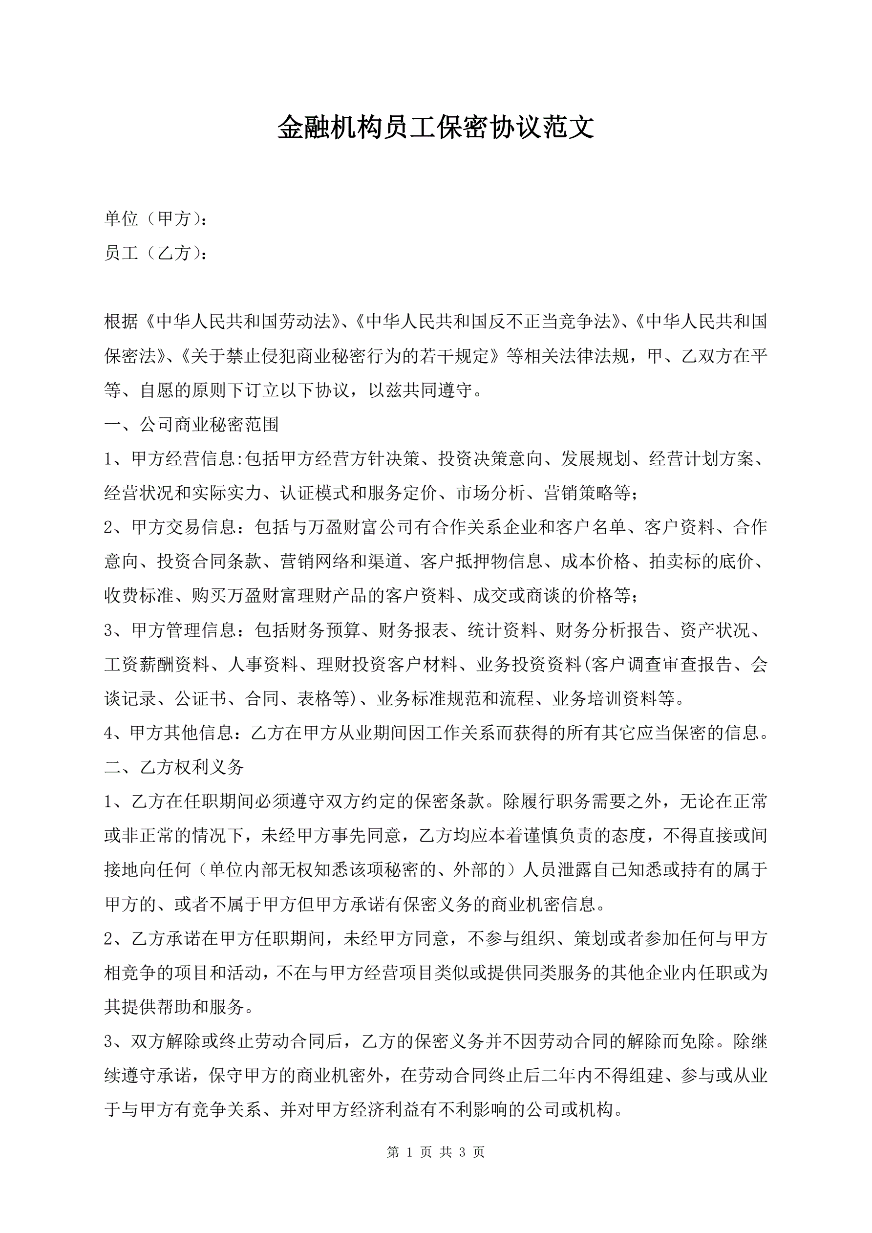 金融机构员工保密协议范文