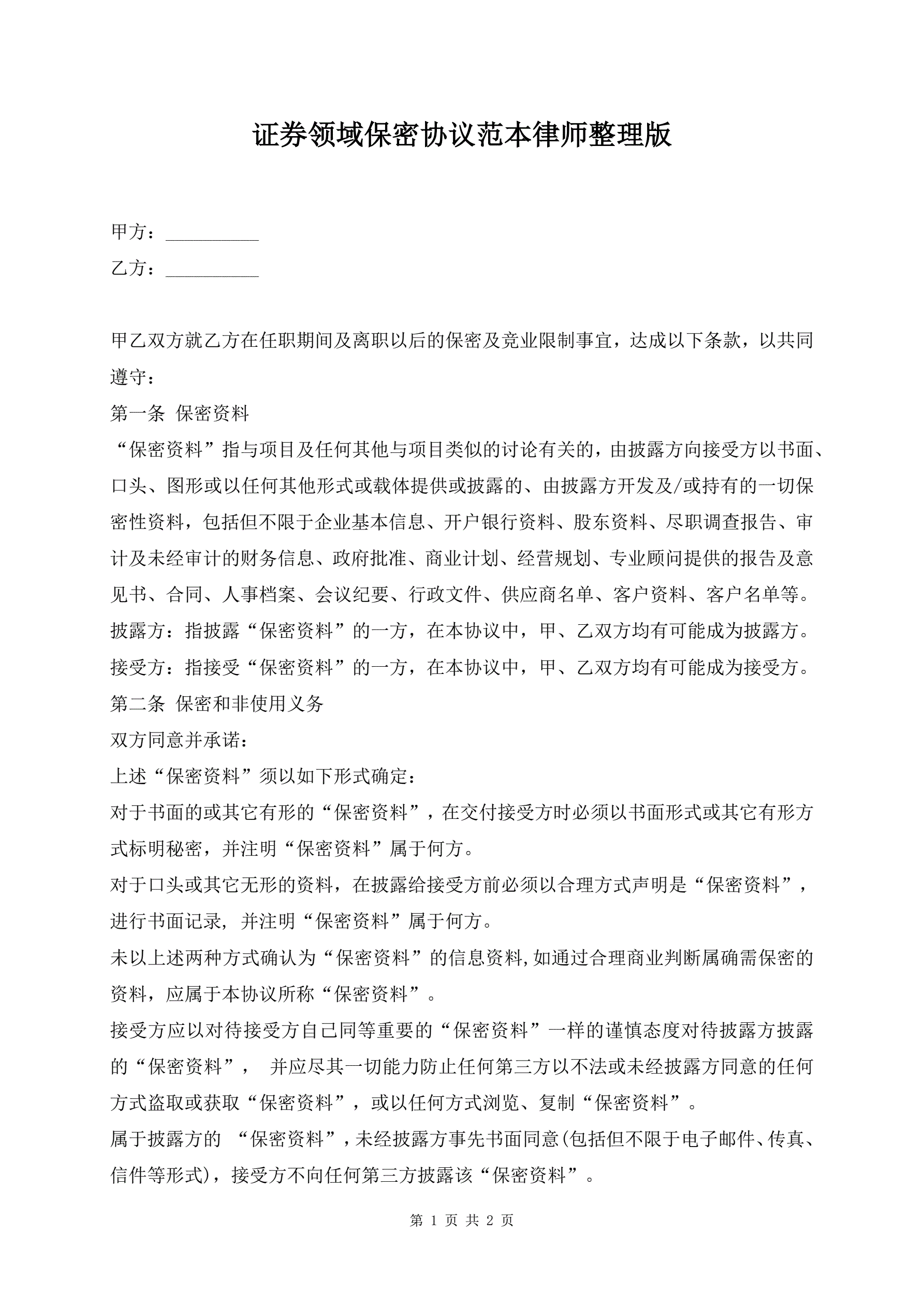 >证券领域保密协议范本律师整理版
