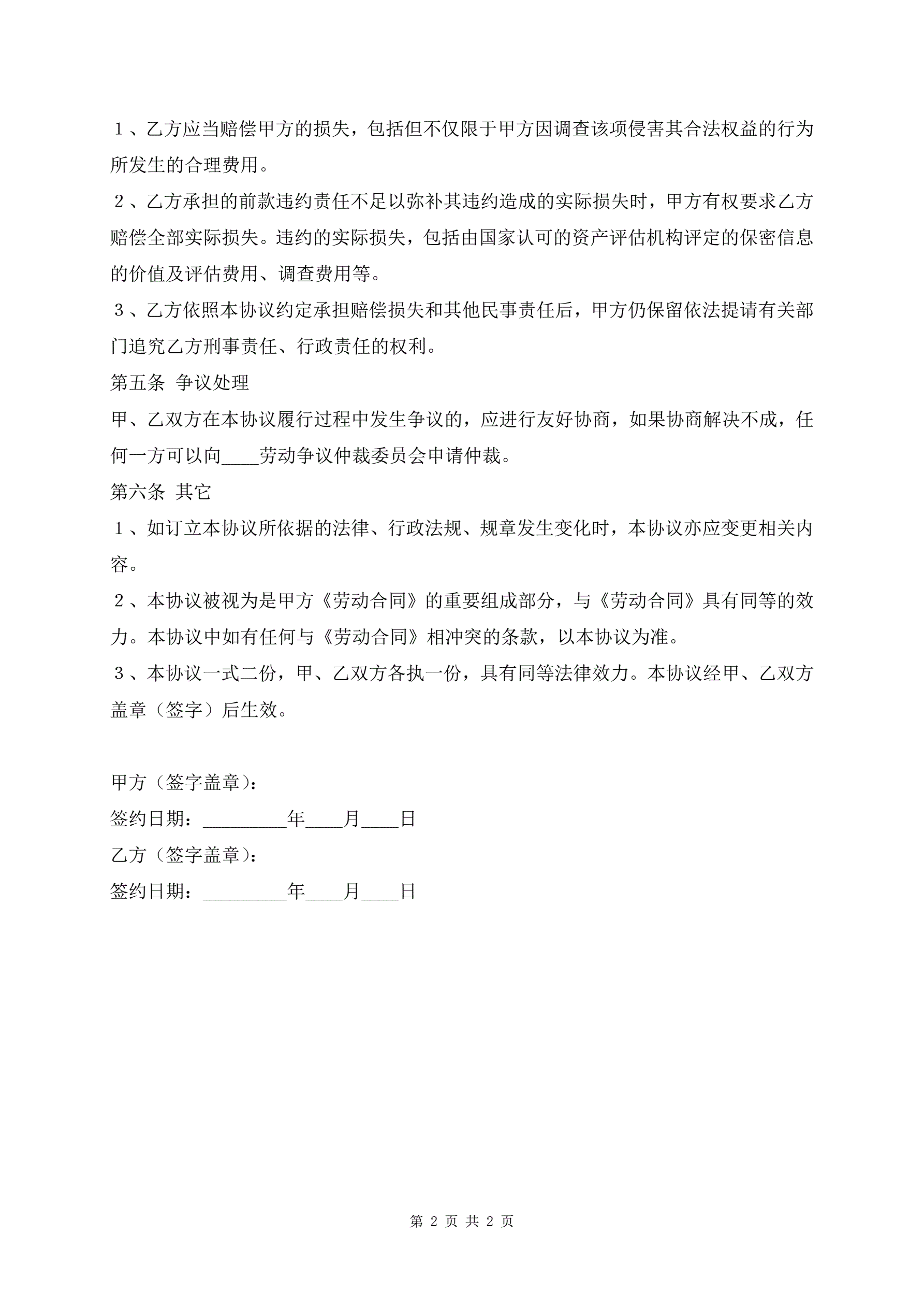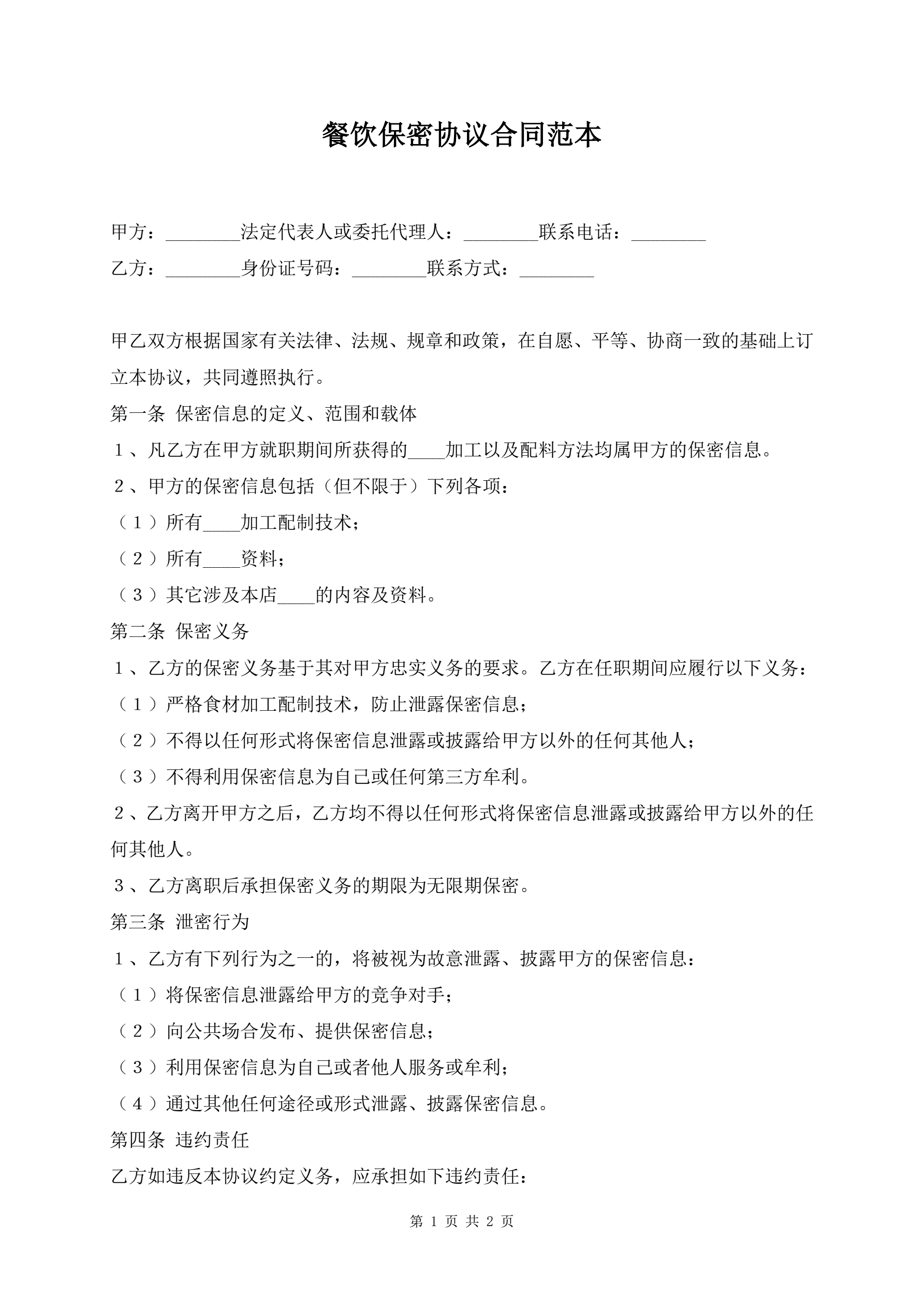 餐饮保密协议合同范本