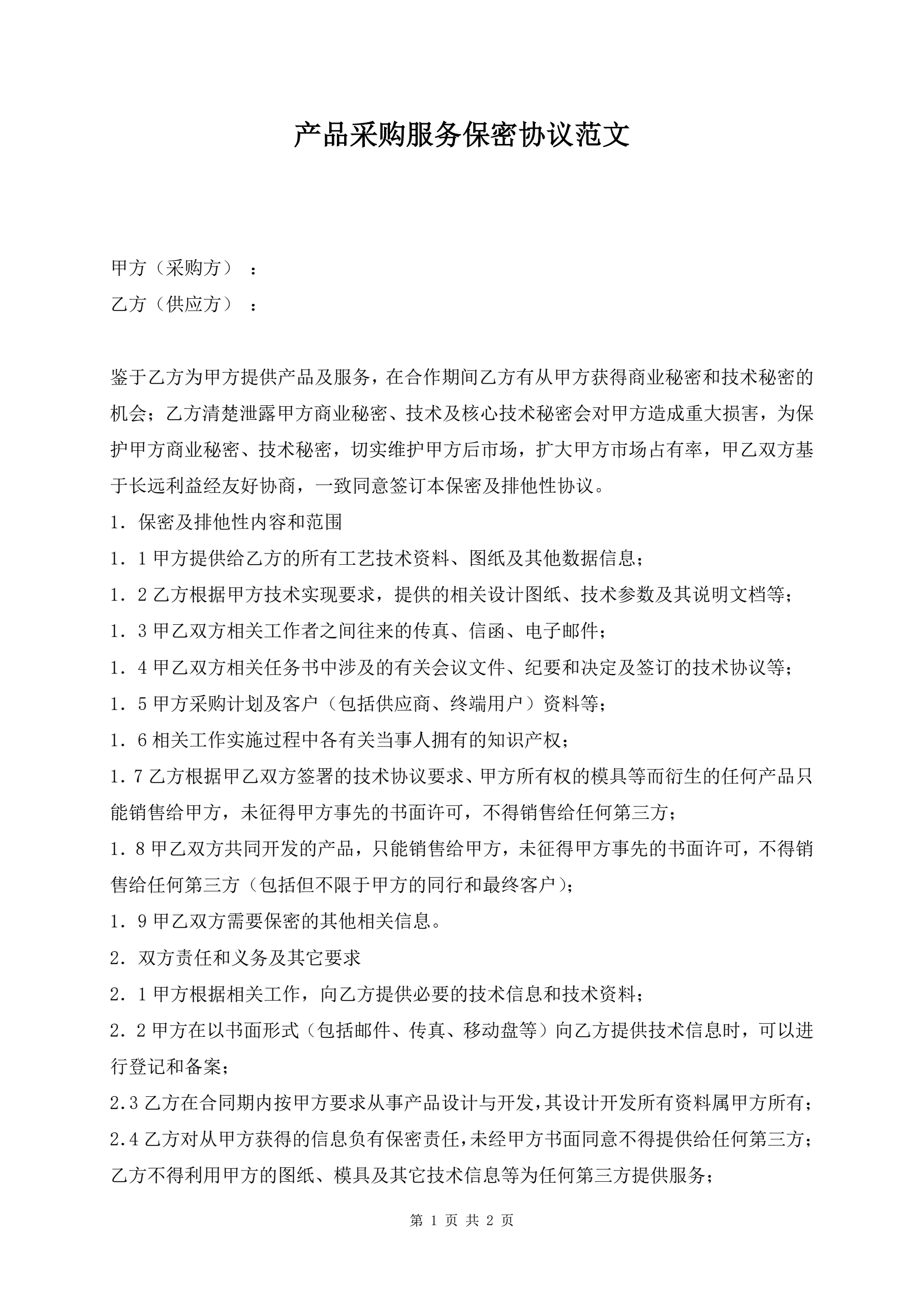 产品采购服务保密协议范文