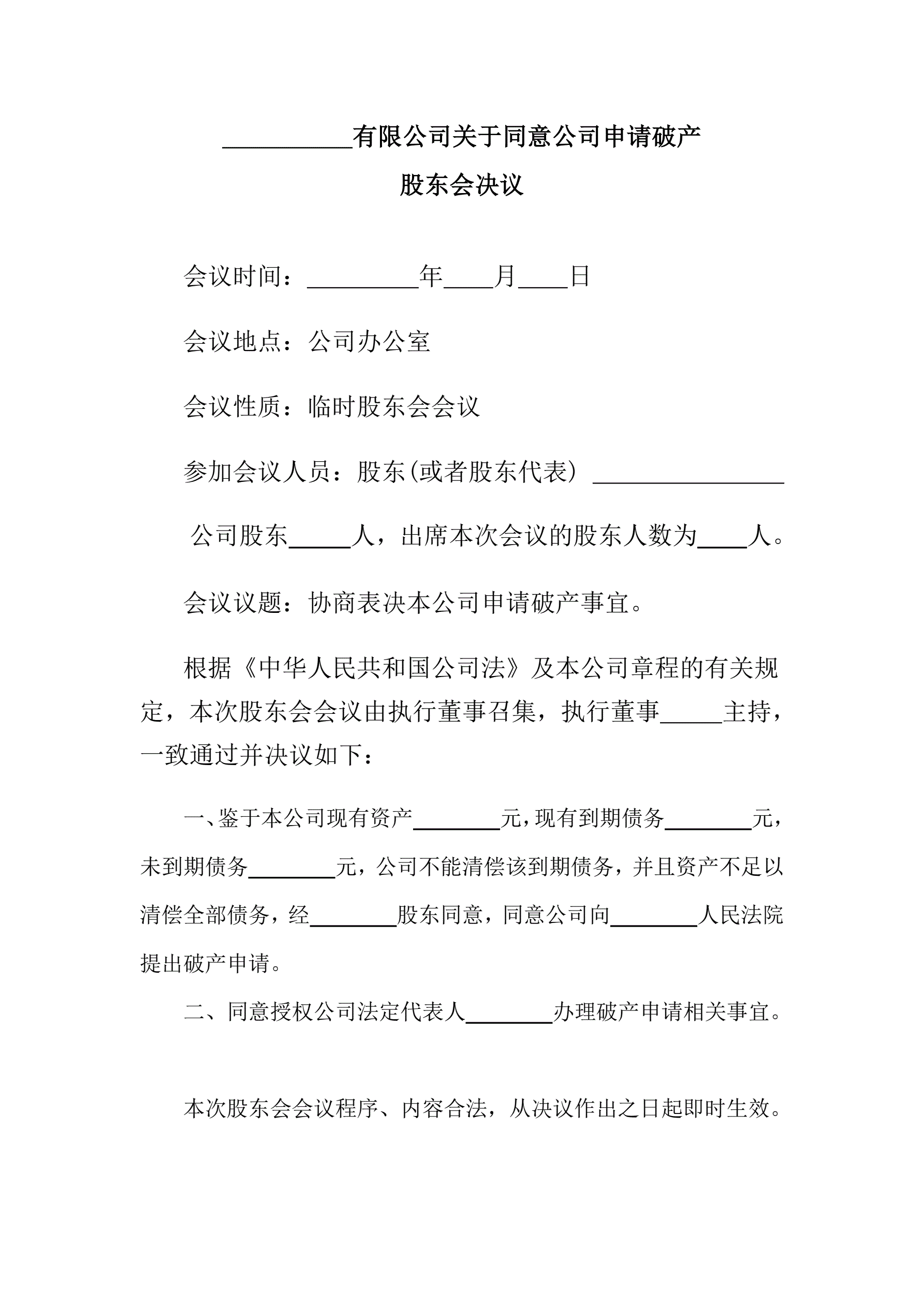 同意申请破产的股东会决议(指导版)