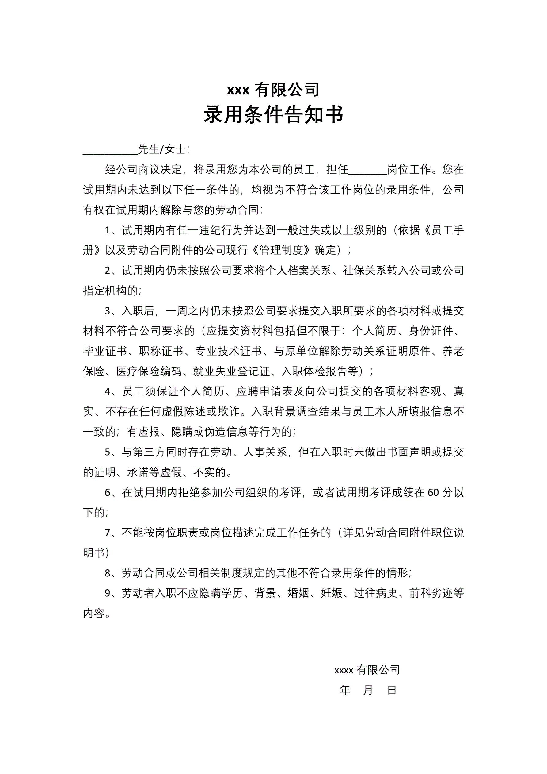 >录用条件告知书(指导版)