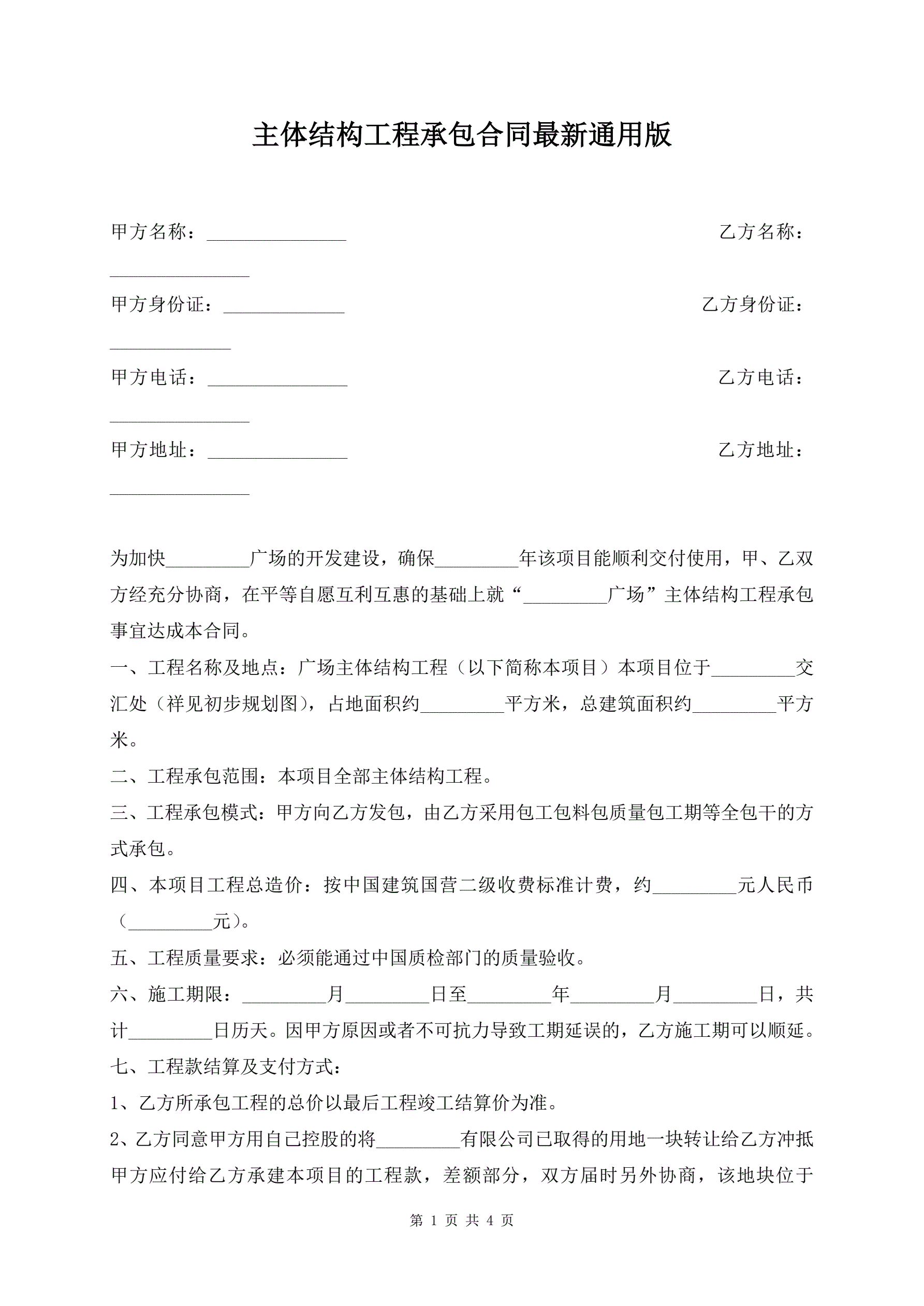 主体结构工程承包合同最新通用版