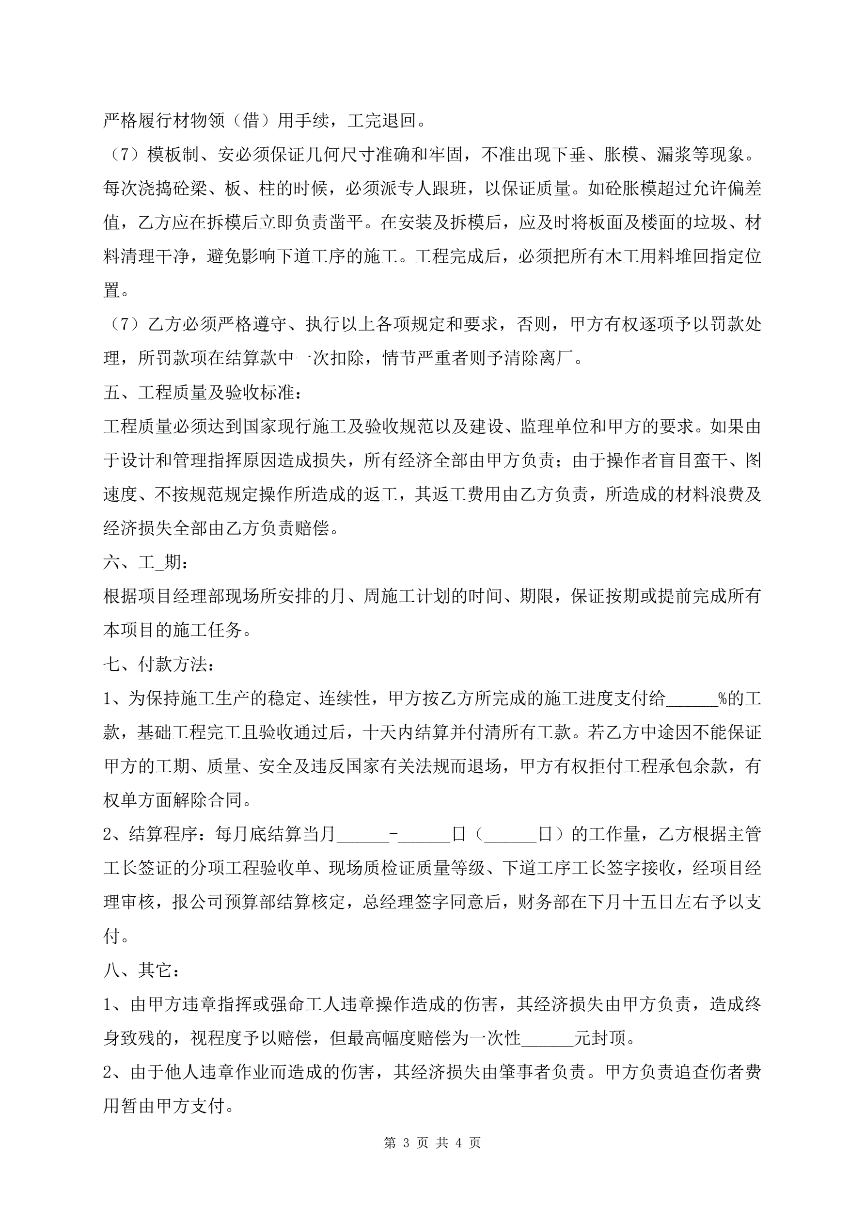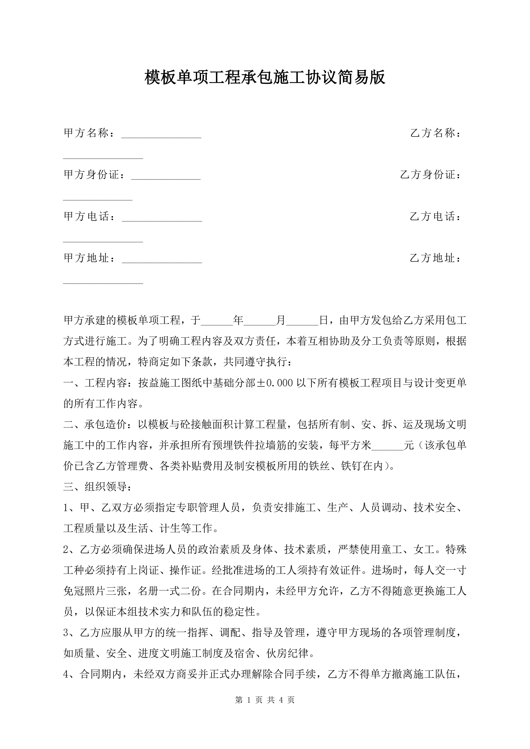 模板单项工程承包施工协议简易版