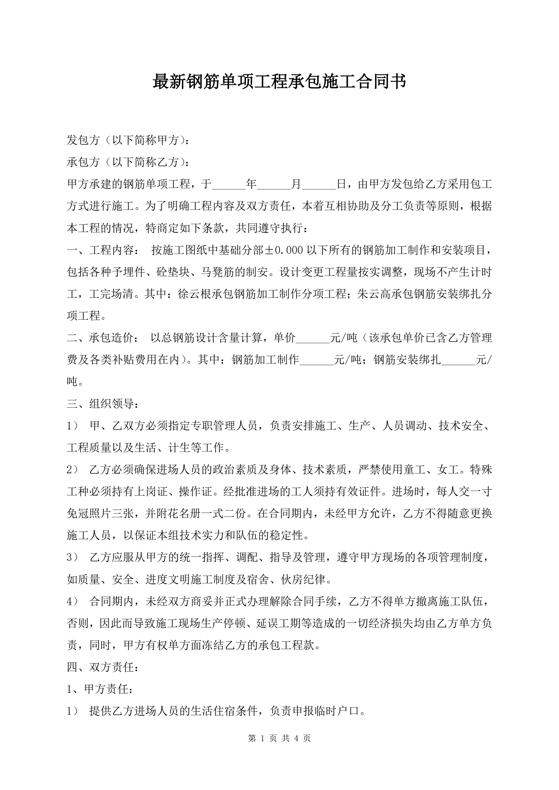 最新钢筋单项工程承包施工合同书