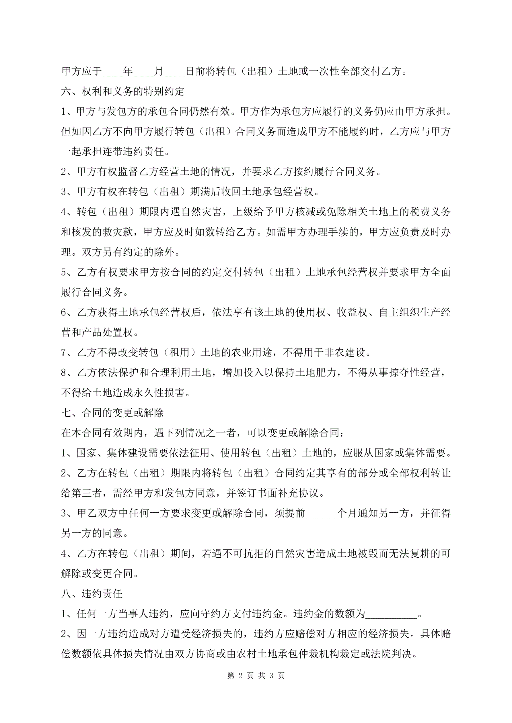 >河南省农村土地承包经营权转包出租合同范本