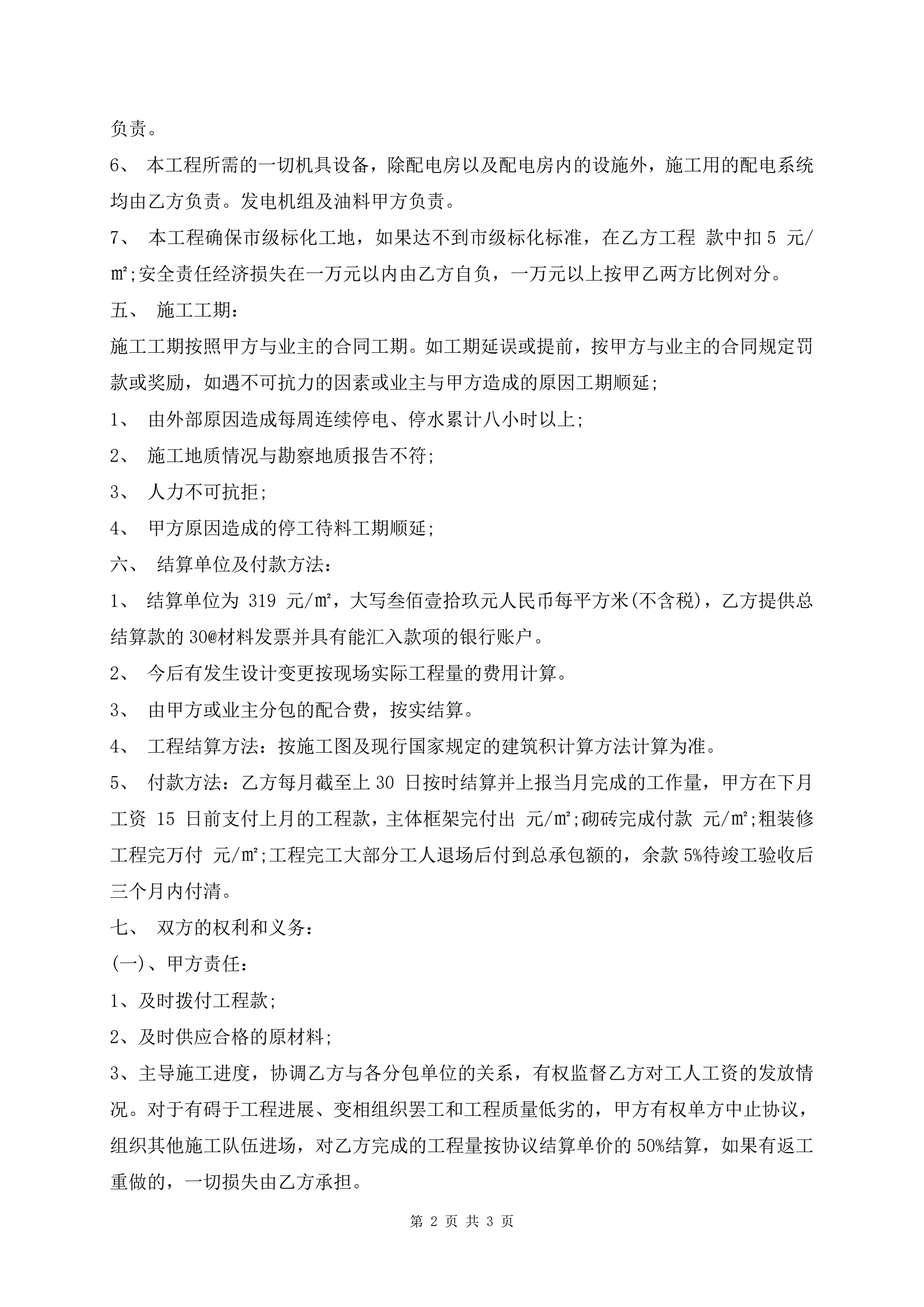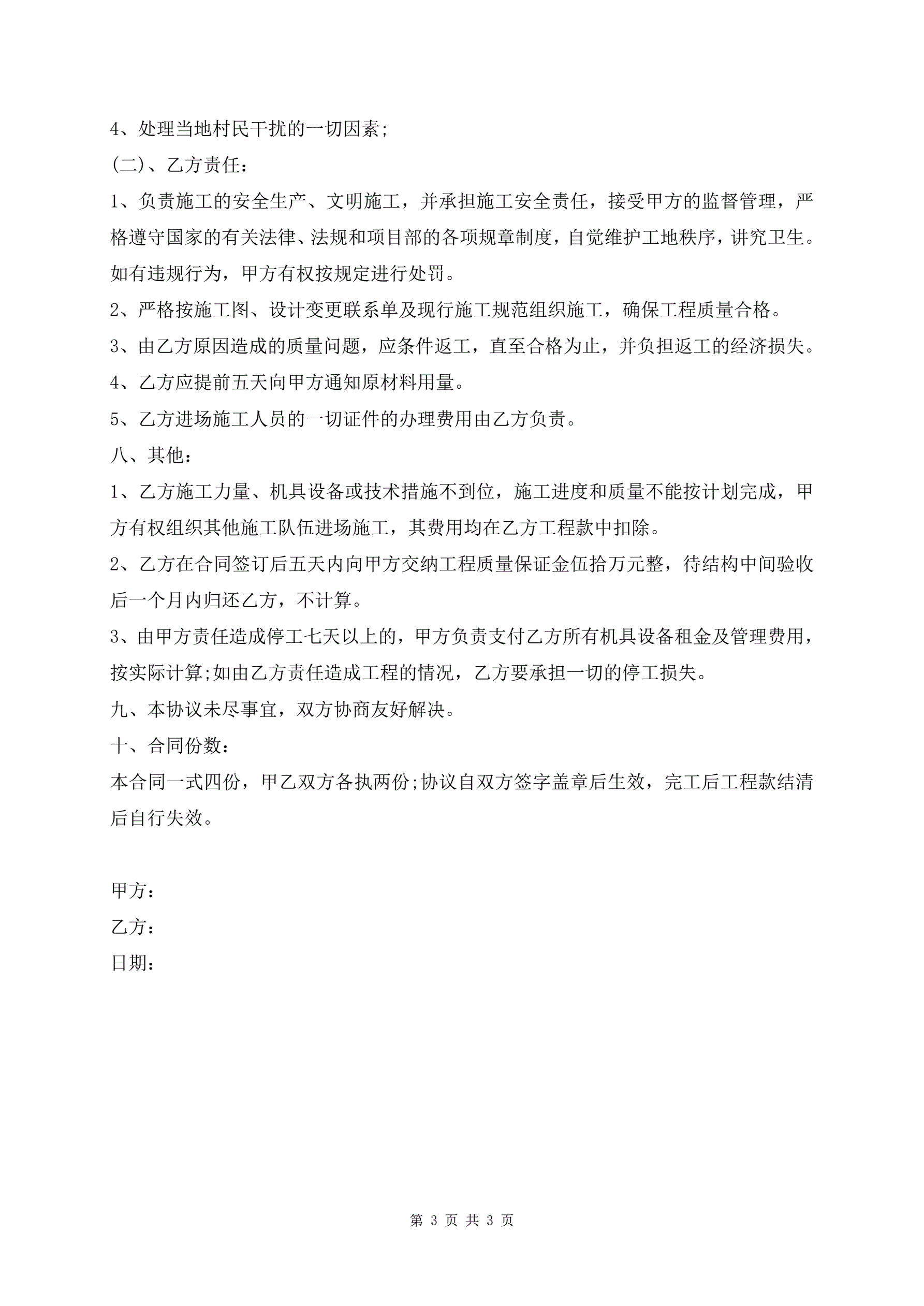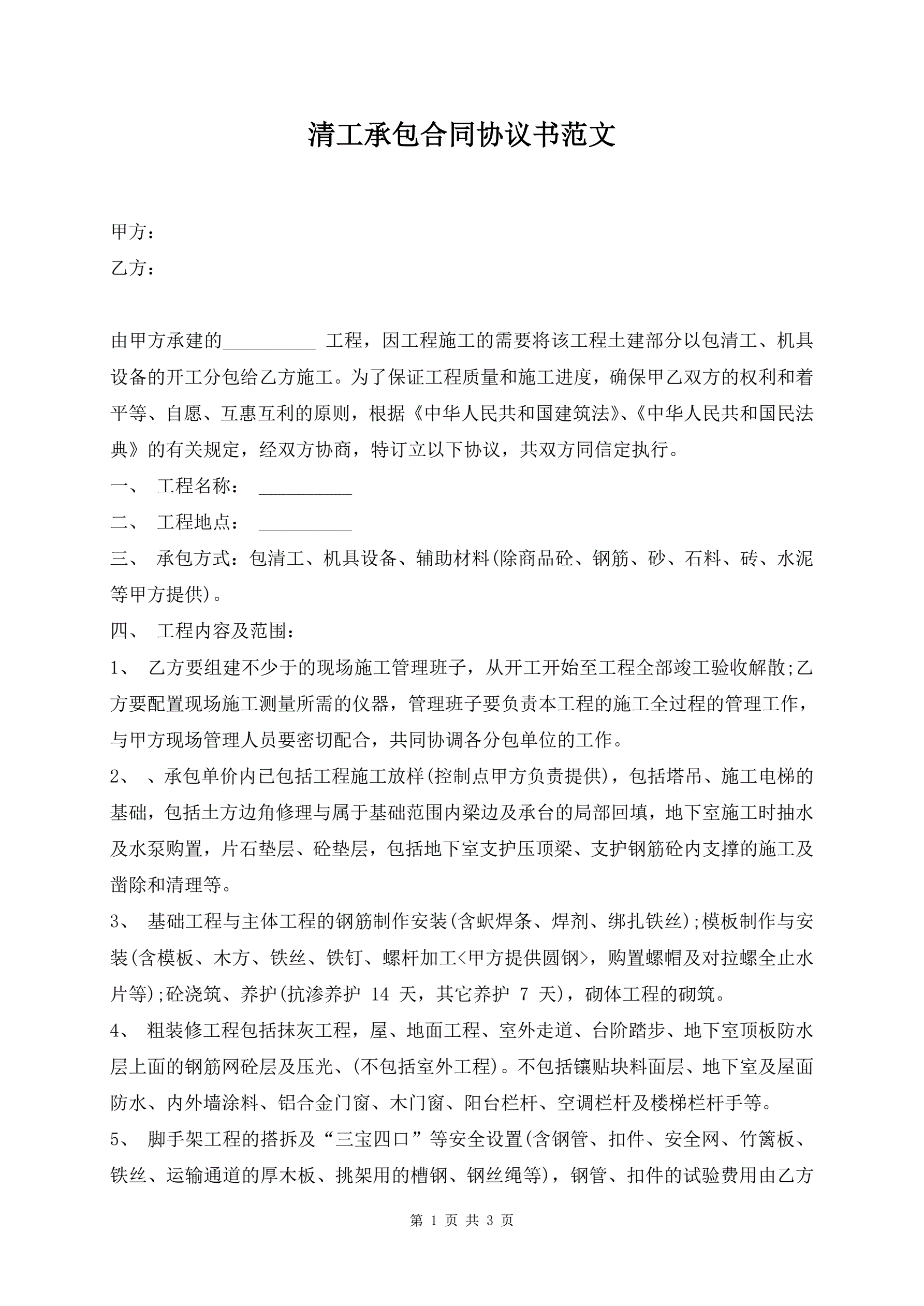 >清工承包合同协议书范文