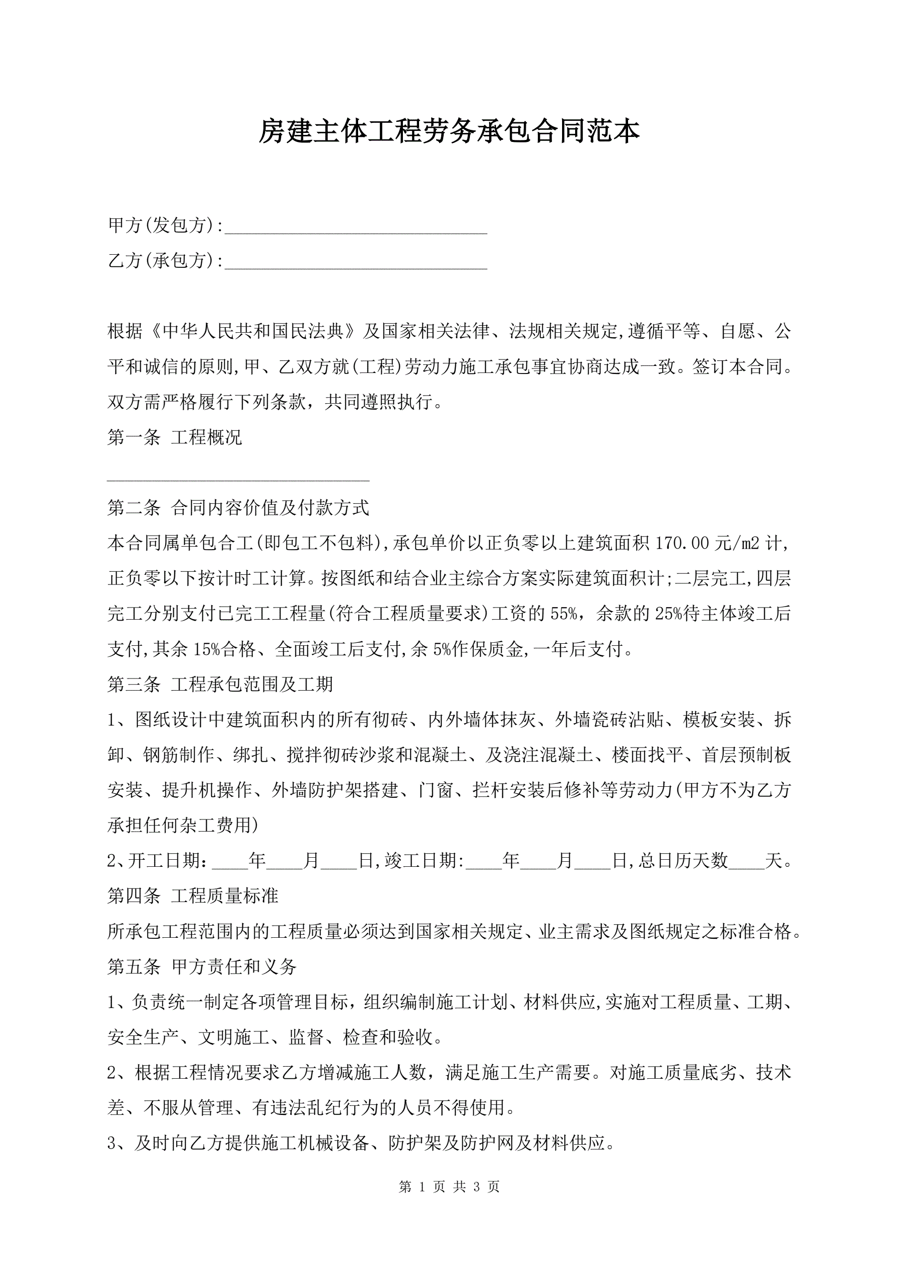 房建主体工程劳务承包合同范本
