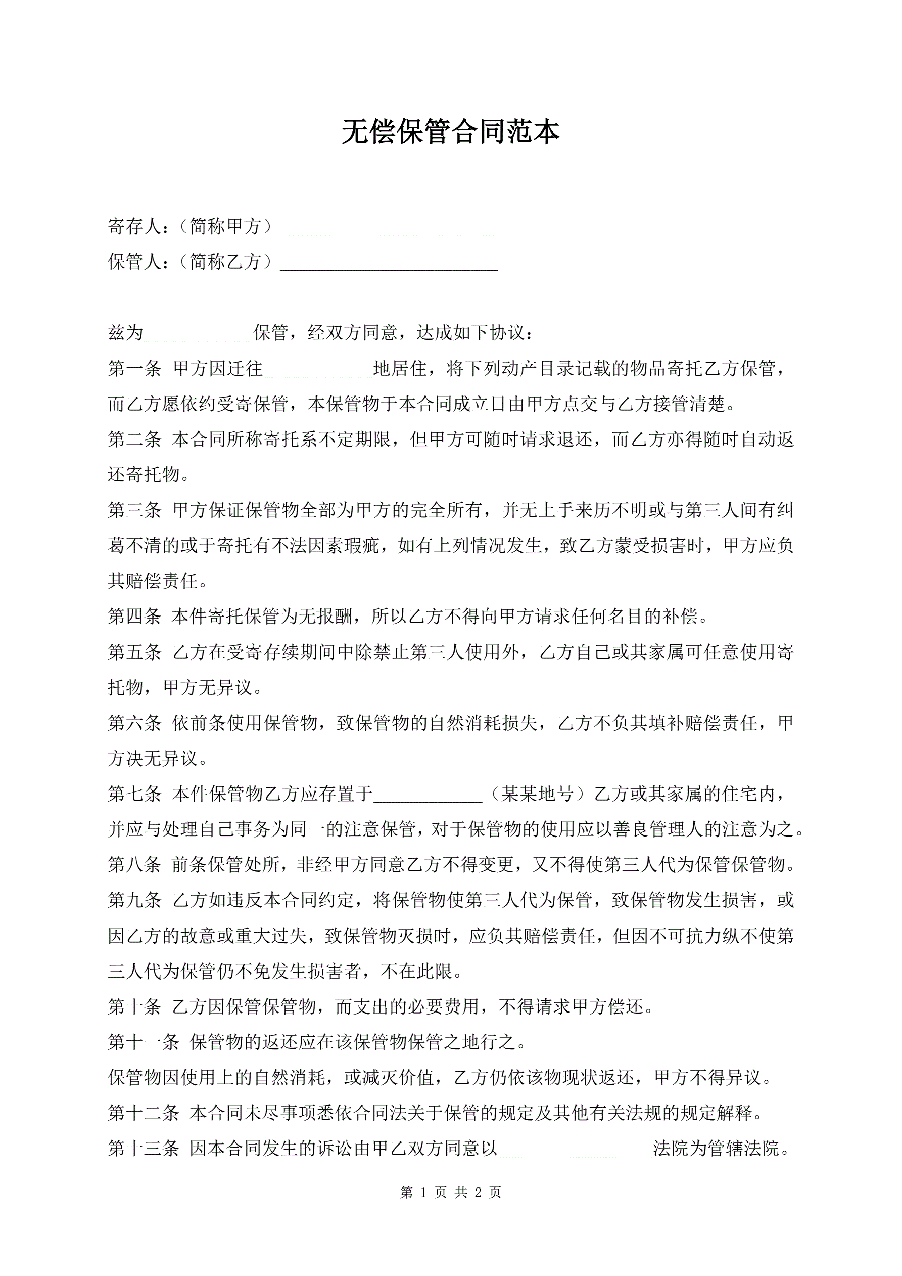 无偿保管合同范本
