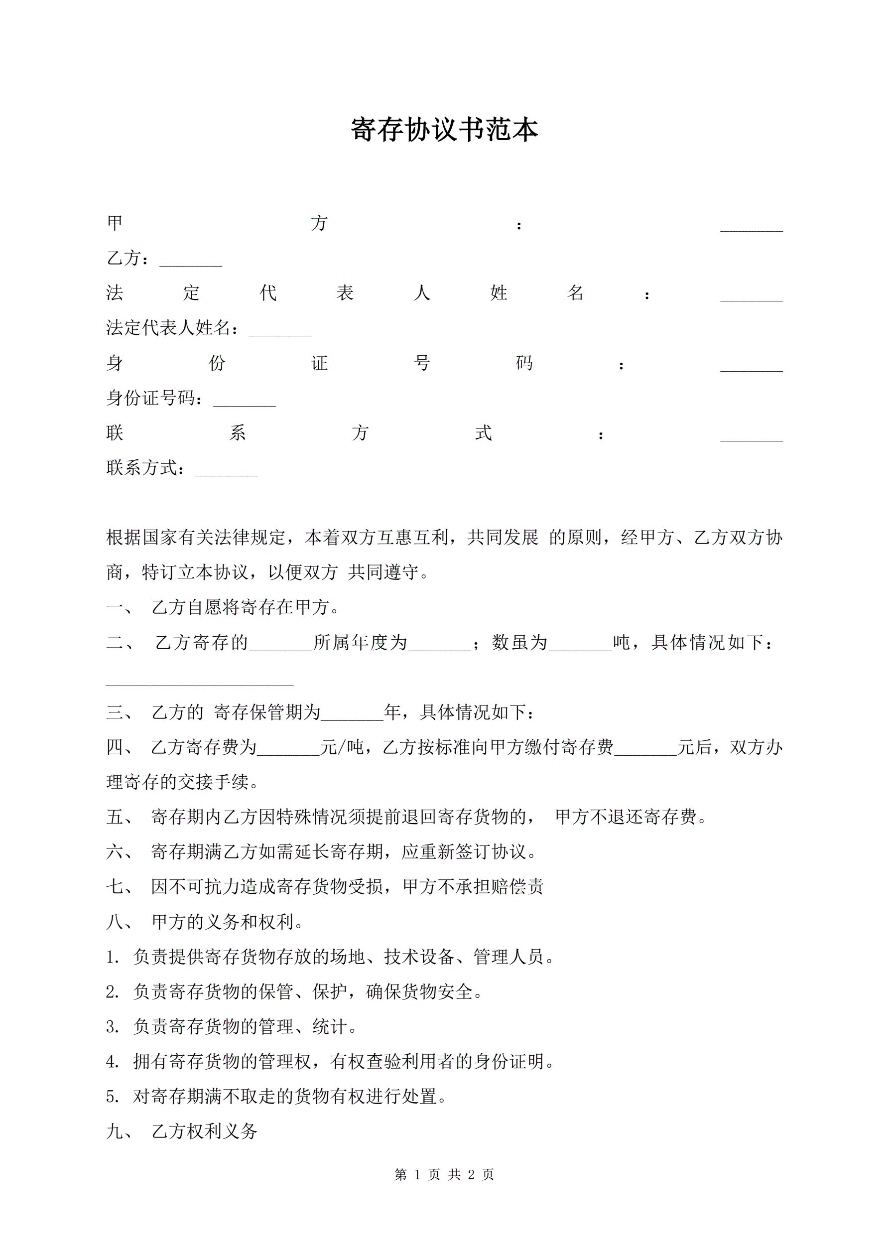 寄存协议书范本